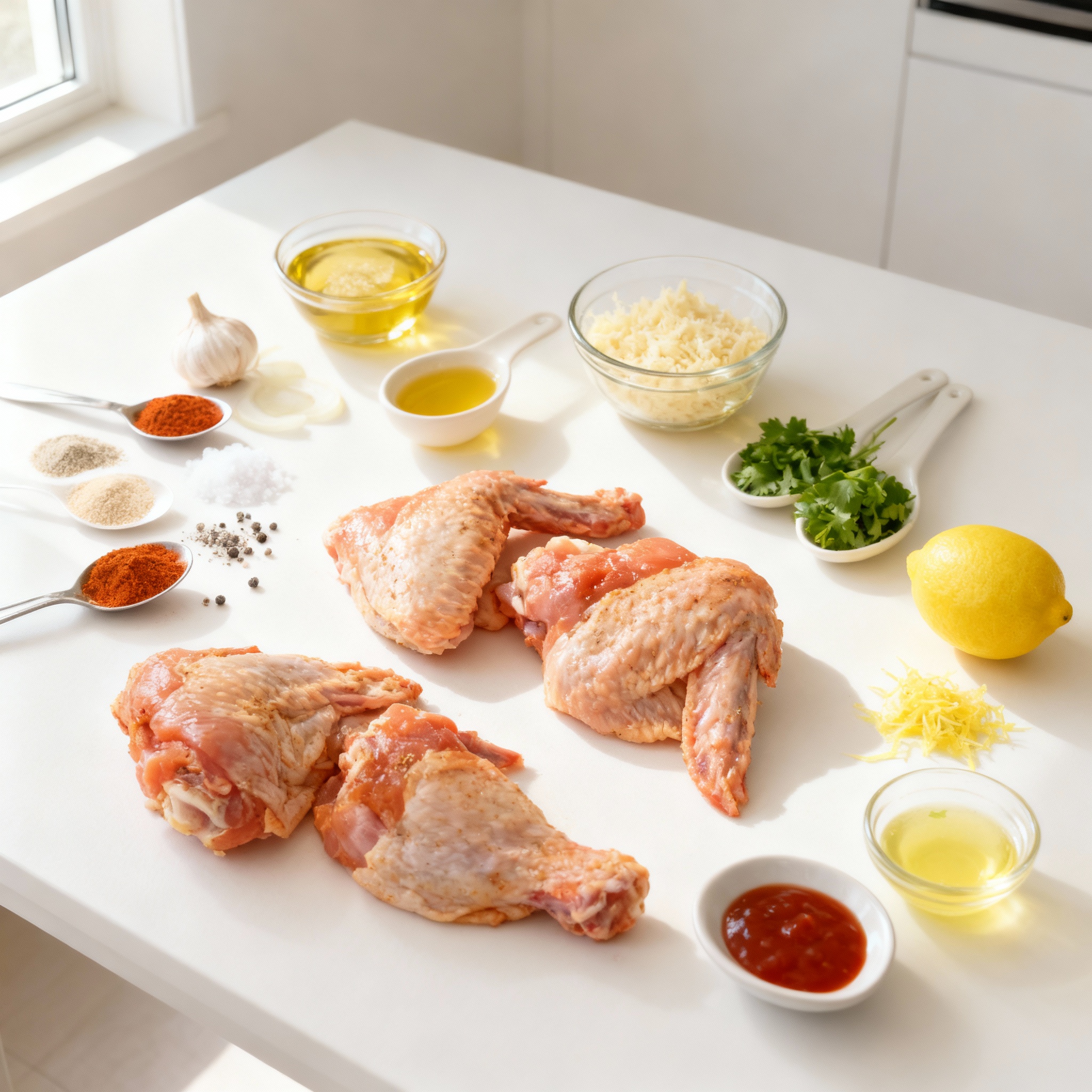 Gather these ingredients before you start. You need 2 pounds of chicken wings. They are the star of the show. Use 1 tablespoon of olive oil to help the seasoning stick. For the seasoning, grab 1 teaspoon each of garlic powder, onion powder, and paprika. Salt and pepper will add flavor too.