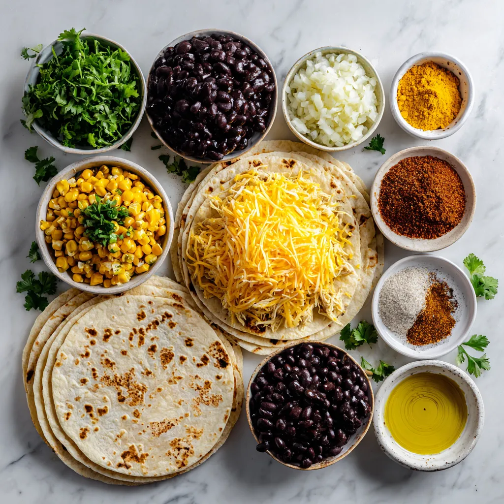 In a large mixing bowl, combine 2 cups of shredded chicken, 1 cup of drained black beans, and 1 cup of corn. Add 1 cup of shredded cheese, such as cheddar or Monterey Jack. Next, mix in 1 small finely chopped onion and 2 minced garlic cloves. For flavor, add 1 teaspoon of ground cumin, 1 teaspoon of chili powder, ½ teaspoon of smoked paprika, ¼ teaspoon of salt, and ¼ teaspoon of black pepper. Stir everything until it is mixed well.