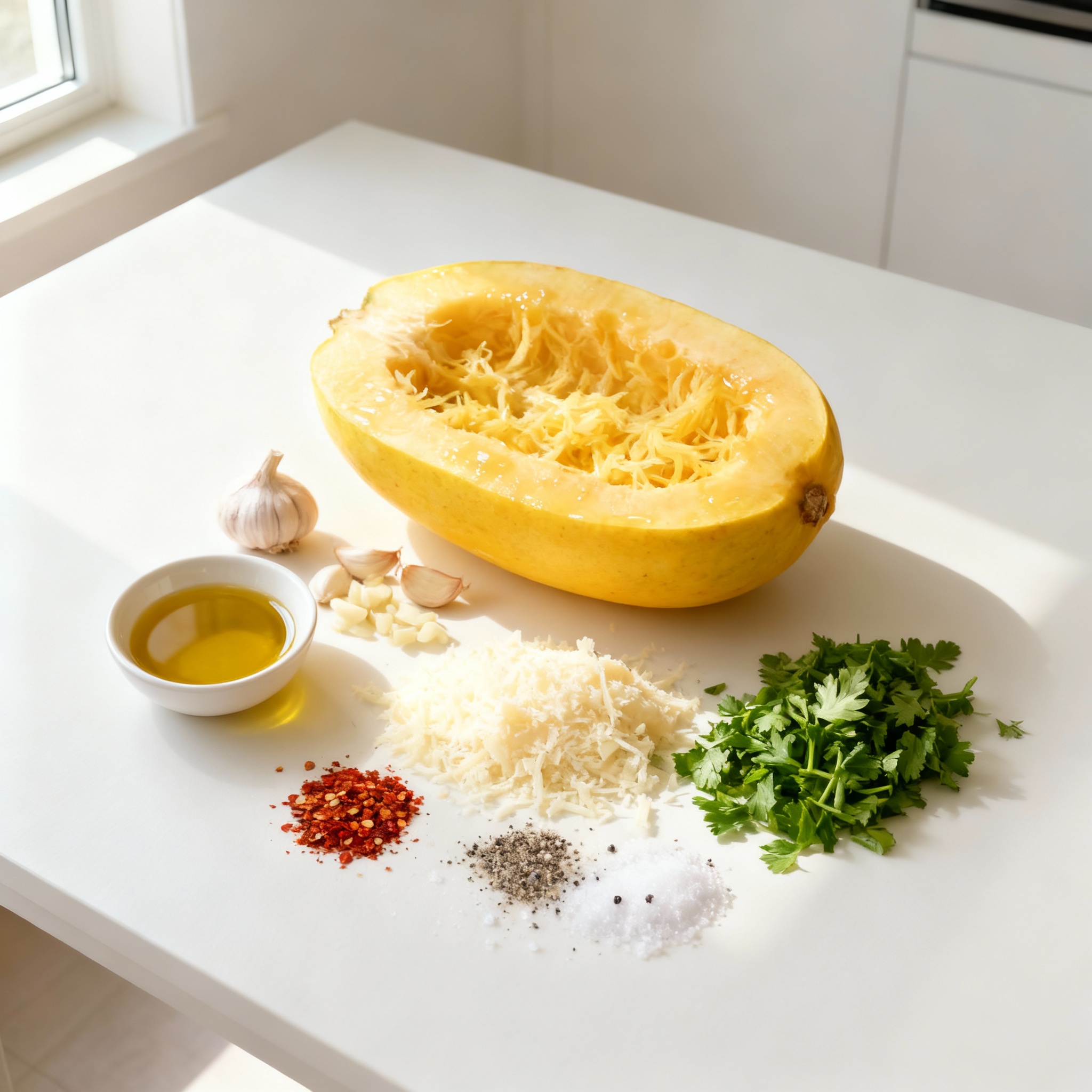The main ingredients for Baked Spaghetti Squash Garlic Parmesan are simple yet flavorful. The spaghetti squash serves as a low-carb base. I love using fresh garlic for a punch of taste. Olive oil adds richness, while Parmesan cheese brings a delicious, cheesy finish.