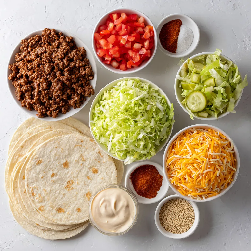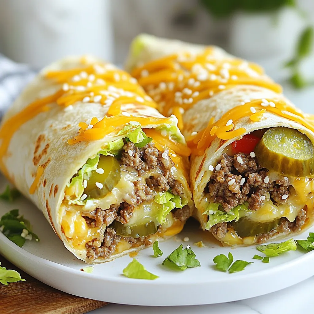 - Assemble the Wraps: Lay each tortilla flat on a plate. In the center of each tortilla, layer some cooked beef, shredded lettuce, diced tomatoes, pickles, cheddar cheese, and a generous drizzle of Thousand Island dressing.