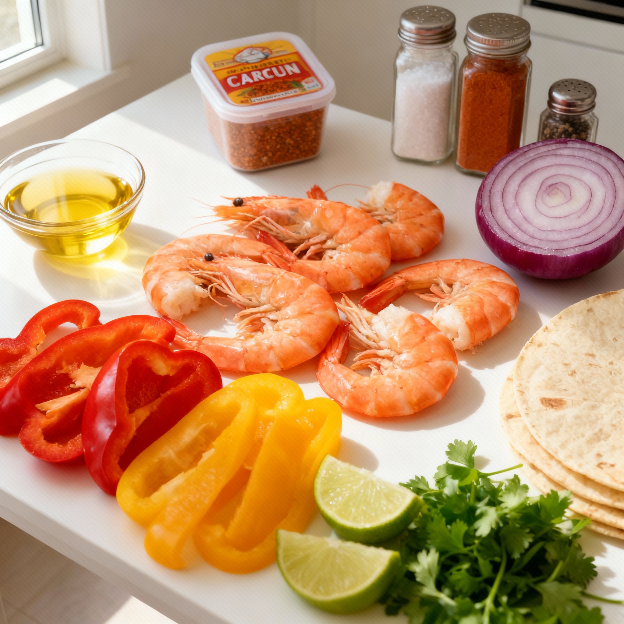 Gathering fresh ingredients makes a big difference in flavor. I always choose large shrimp for this dish. They cook evenly and stay juicy. The bright colors of red and yellow bell peppers add sweetness and crunch. A large red onion gives a nice bite.