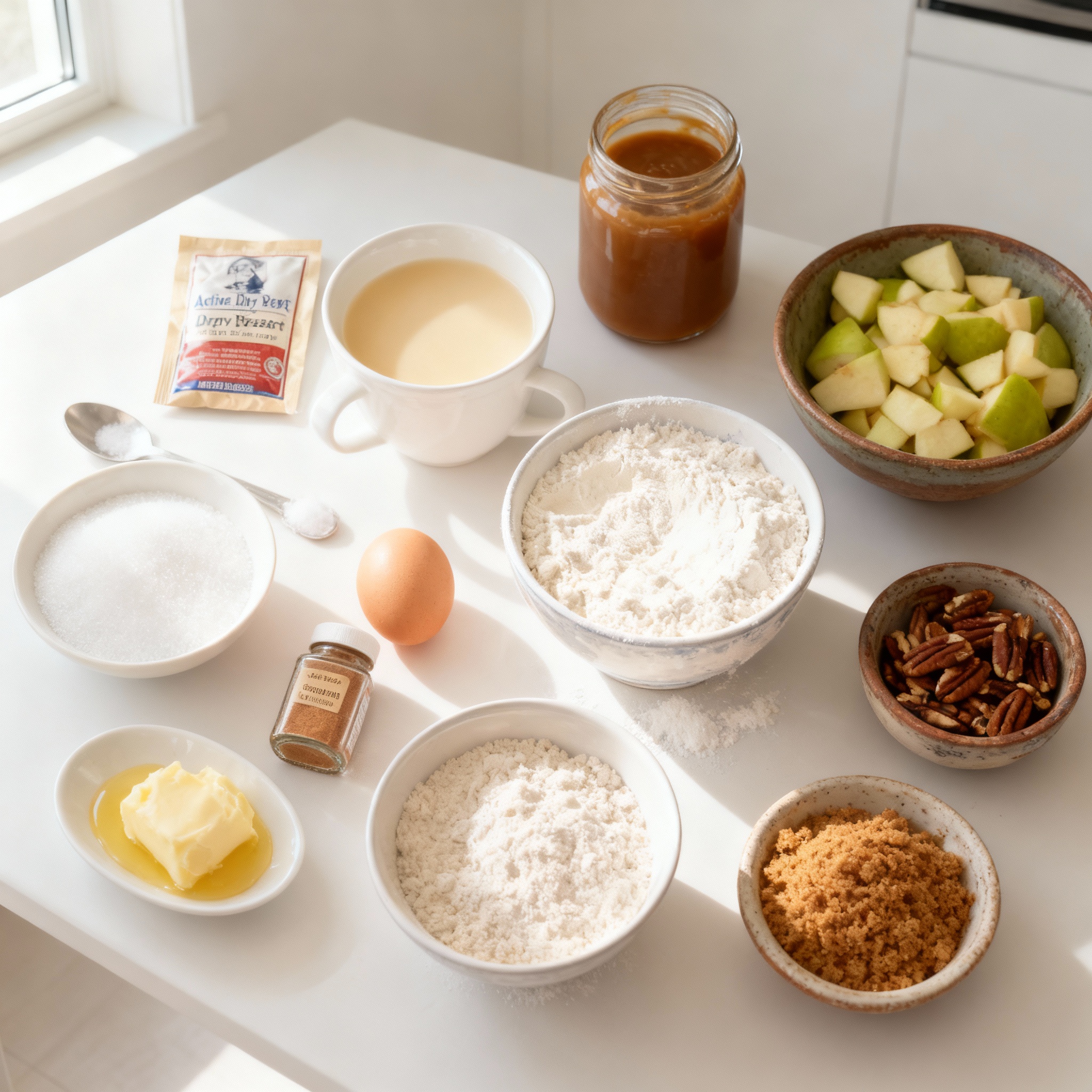 For the dough, all-purpose flour is essential. Ground cinnamon brings warmth and spice. You should use a Granny Smith apple for a tart bite. Brown sugar gives a deep, caramel flavor. Chopped pecans are optional, but they add a nice crunch. Lastly, pick a good caramel sauce for drizzling on top.