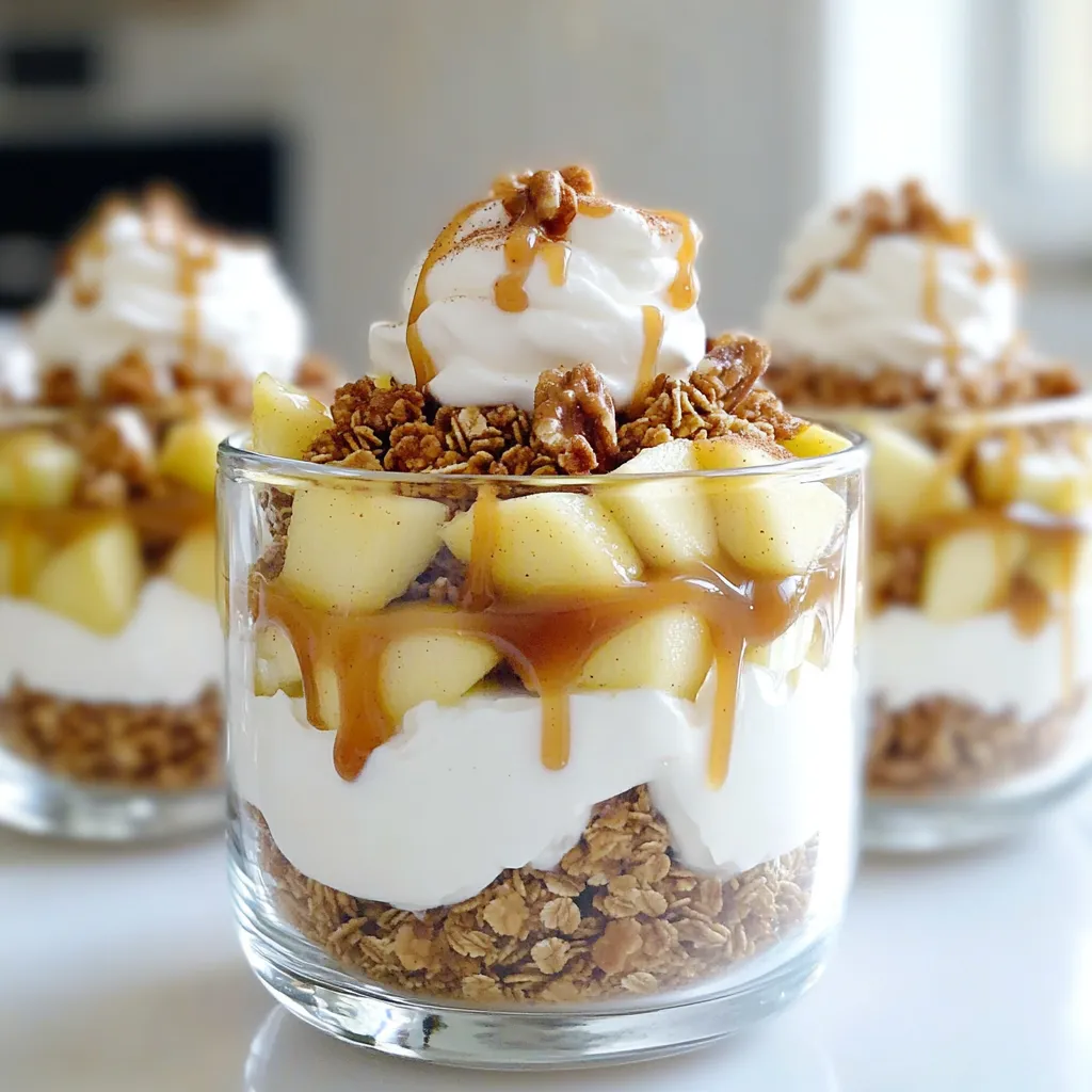 Now, gather your parfait glasses or bowls. Begin with a layer of Greek yogurt at the bottom of each glass, about ¼ cup per serving. This creamy base is essential for a rich taste. Next, spoon a third of the apple mixture over the yogurt. Drizzle 1 tablespoon of caramel sauce on top of the apples. The caramel adds a sweet touch. After that, sprinkle about 2 tablespoons of granola over the caramel for crunch. Repeat these layers until your glass is full. Finish with a layer of yogurt and a drizzle of caramel sauce.