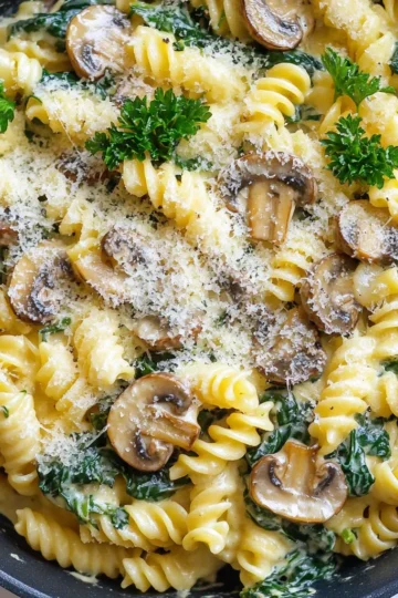 - Parmesan Spinach Mushroom Pasta Skillet Delight