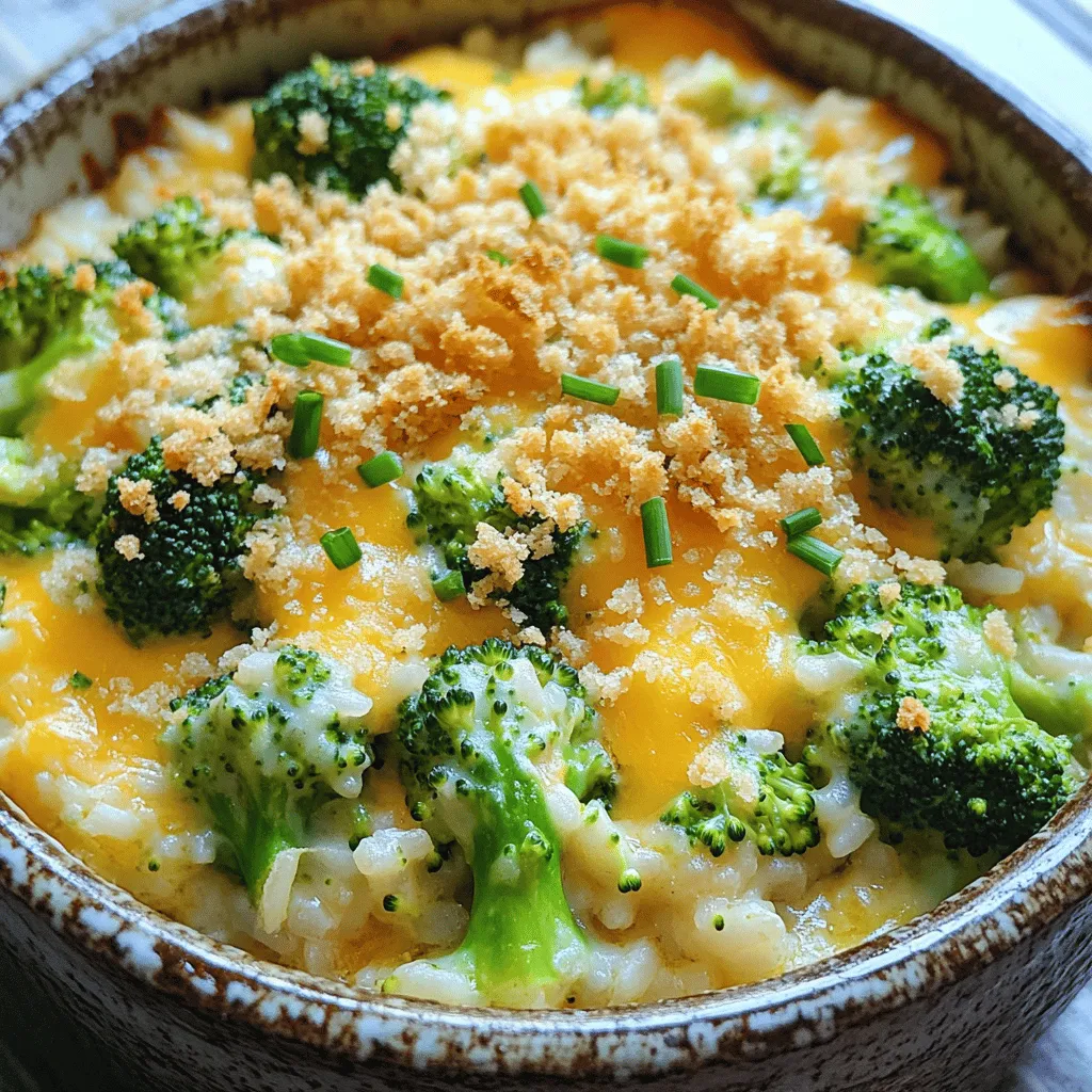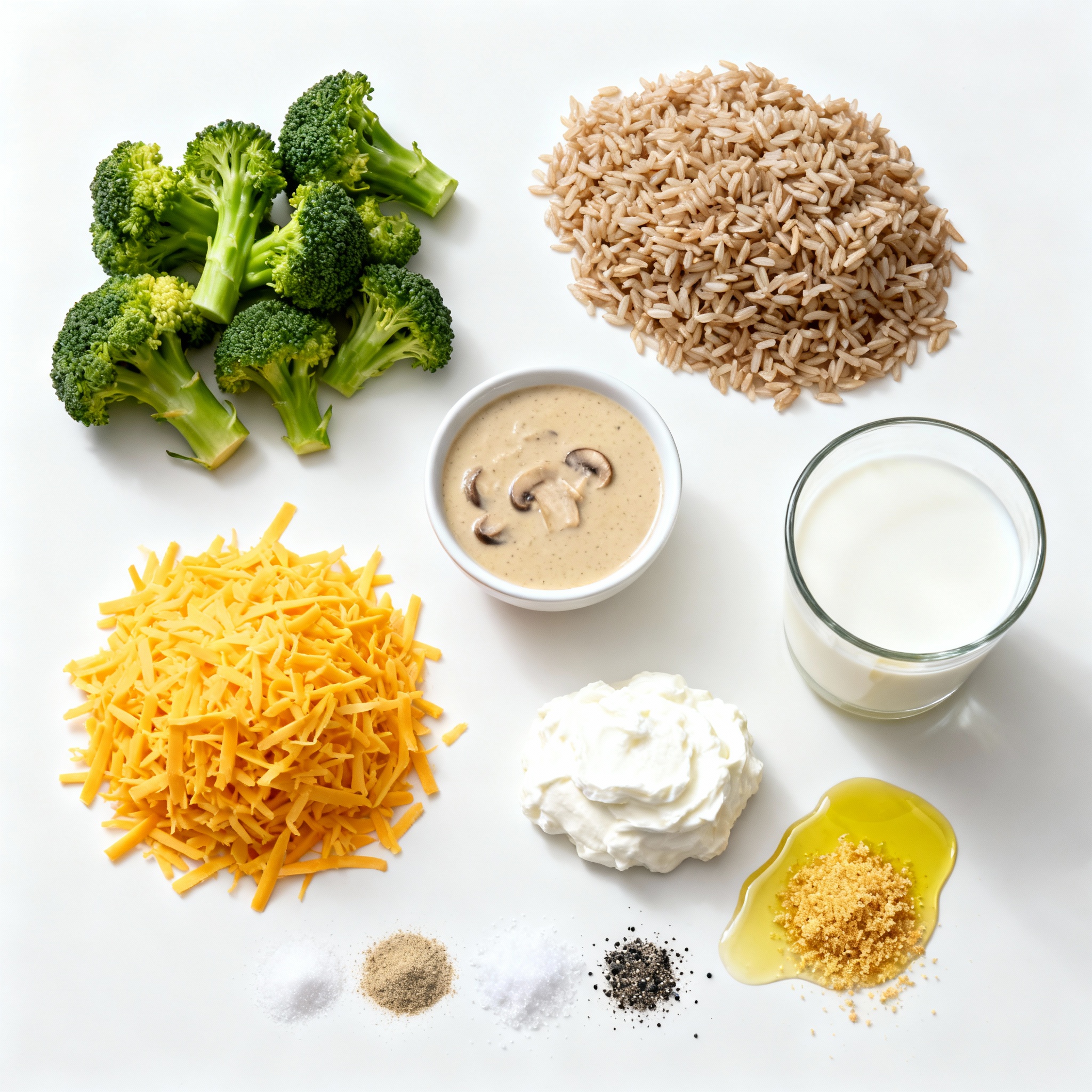 Gather these simple ingredients to create a warm and cheesy dish. Brown rice adds a hearty base, while broccoli brings color and nutrition. Sharp cheddar cheese melts beautifully, making every bite creamy and rich. Cream of mushroom soup enhances the flavor, adding a savory depth. Sour cream and milk keep the mixture moist and smooth.