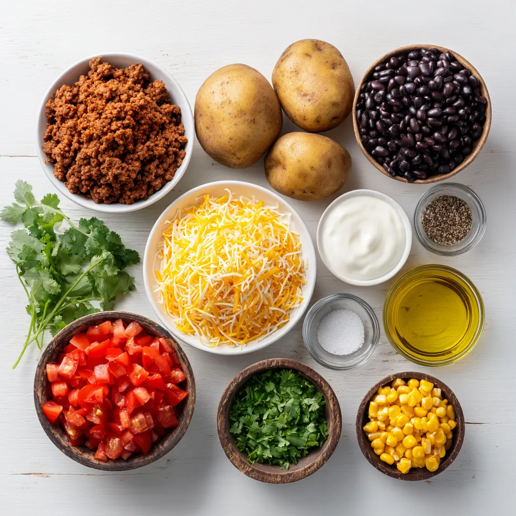 When making cheesy taco potatoes, gathering the right ingredients is key. Start with four large russet potatoes. They are perfect for baking and hold up well.