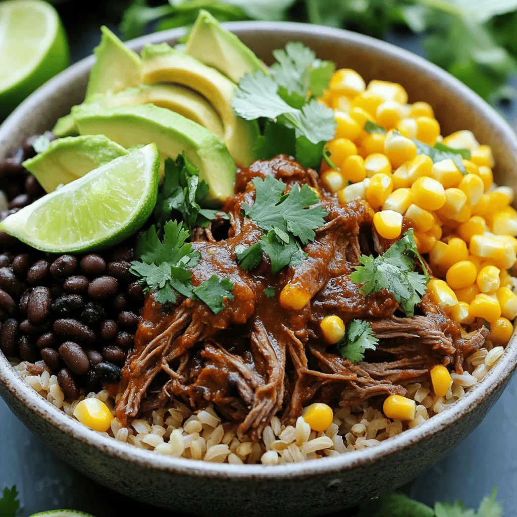 - To assemble the bowls, start with a base of brown rice, followed by a generous serving of the shredded barbacoa beef. Add a scoop of black beans and corn, and top with avocado slices.
