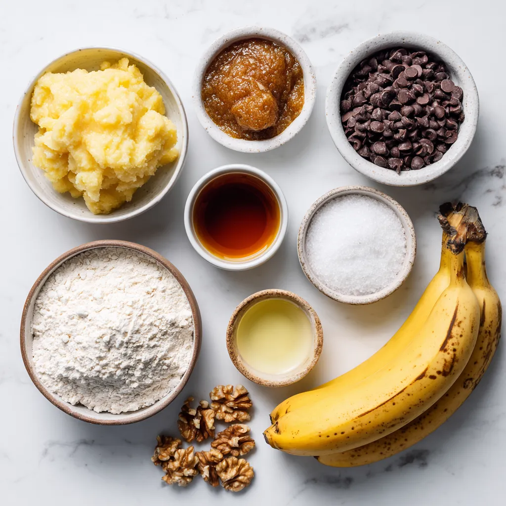 The main ingredients for chocolate chip banana bread are simple and easy to find. Ripe bananas are key for sweetness and moisture. They should be soft and have brown spots on the skin. The coconut oil adds a nice flavor and keeps the bread moist. Brown sugar gives a richer taste than white sugar.