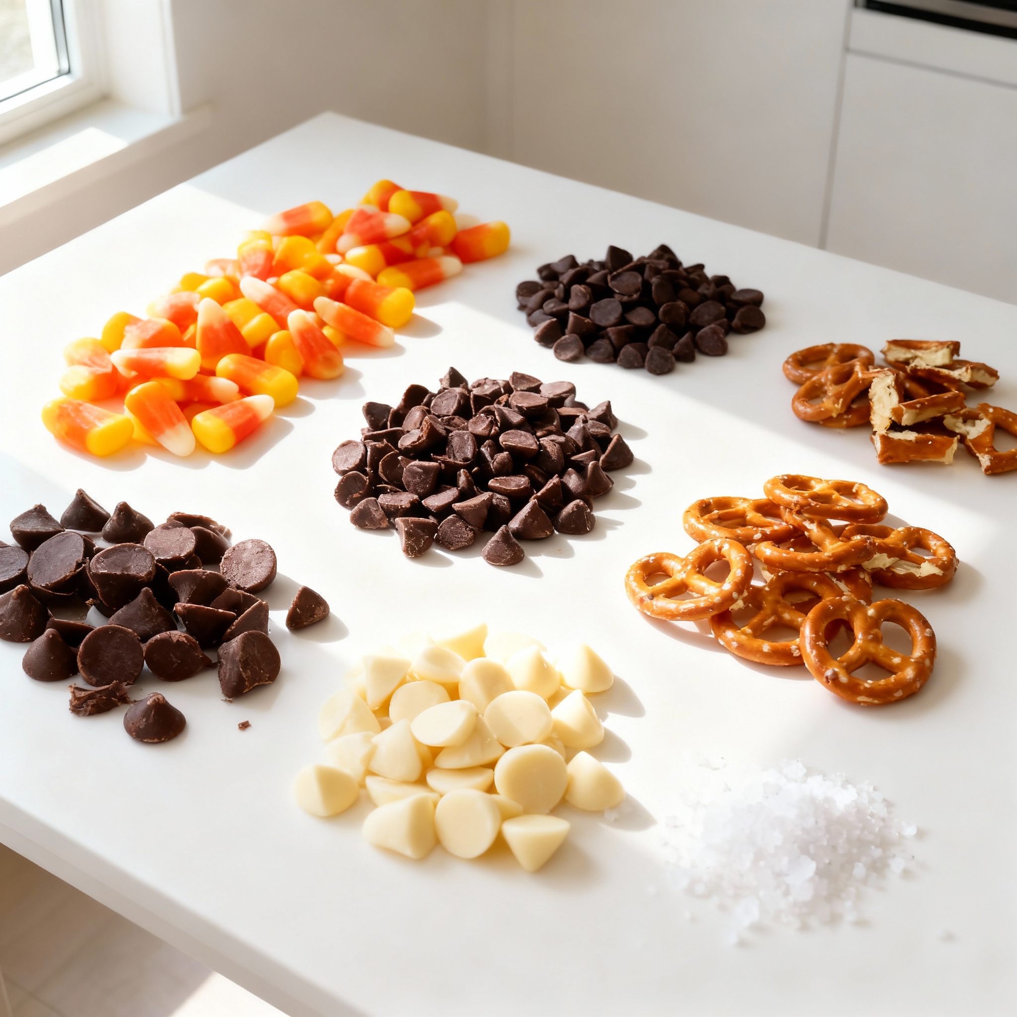 Gathering the right ingredients makes this treat a breeze. The star of the show is the semi-sweet chocolate. It gives the bark a rich, sweet taste. Candy corn adds a fun crunch and colorful flair. The mini pretzels bring a delightful salty twist, balancing the sweetness of the chocolate.