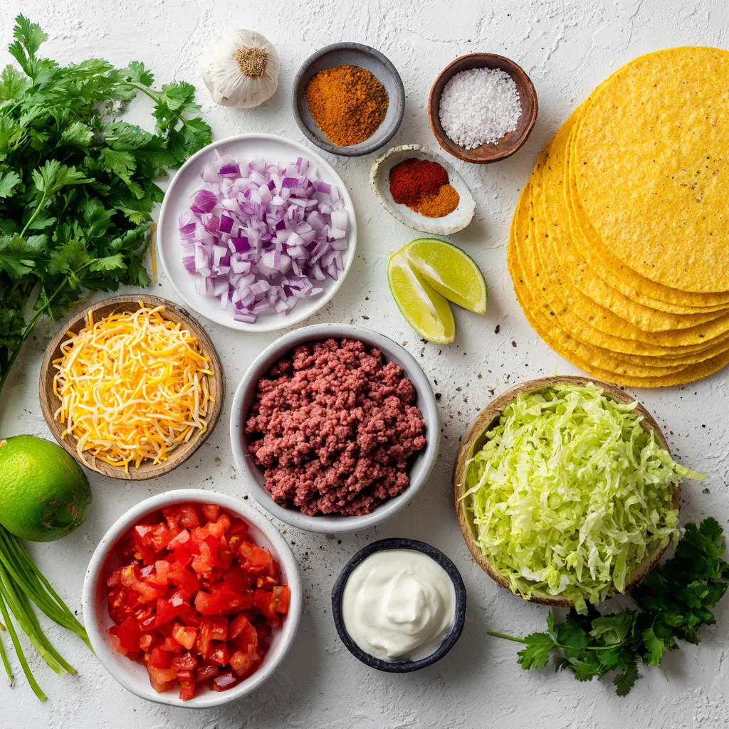Gathering the right ingredients makes cooking fun and easy. Here’s what you need for crispy baked ground beef tacos. Start with 1 pound of ground beef. This is the base for your flavor. Next, get a small onion and two cloves of garlic. These add a great taste to your beef.