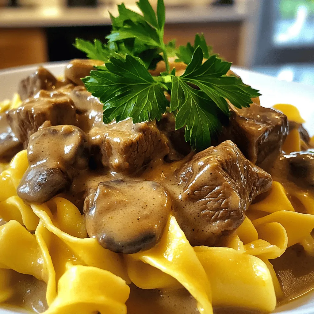 Egg noodles are a great match for beef stroganoff. Cook them just before serving. Drain them and toss them with the sauce. You can also serve the sauce on top of the noodles. For a nice touch, sprinkle fresh parsley on top. It adds color and flavor. Enjoy this cozy meal with a side salad or some crusty bread.