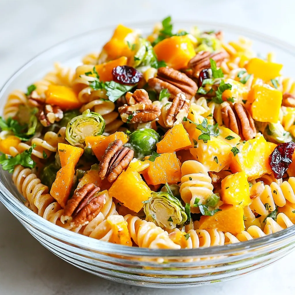 1. In a large bowl, combine the cooled pasta, roasted butternut squash, and Brussels sprouts.