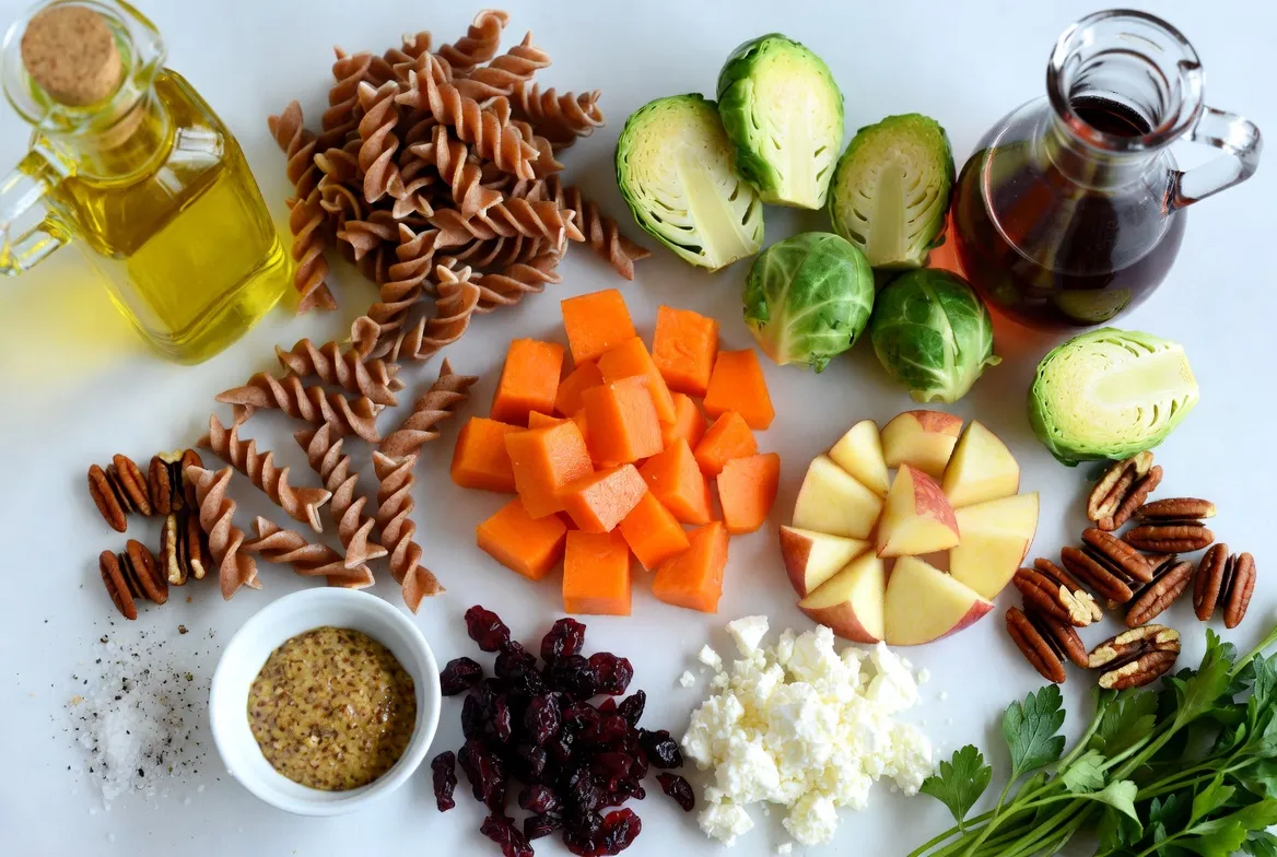 - In a large mixing bowl, combine the cooled pasta, roasted butternut squash and Brussels sprouts, diced apple, dried cranberries, and chopped pecans.