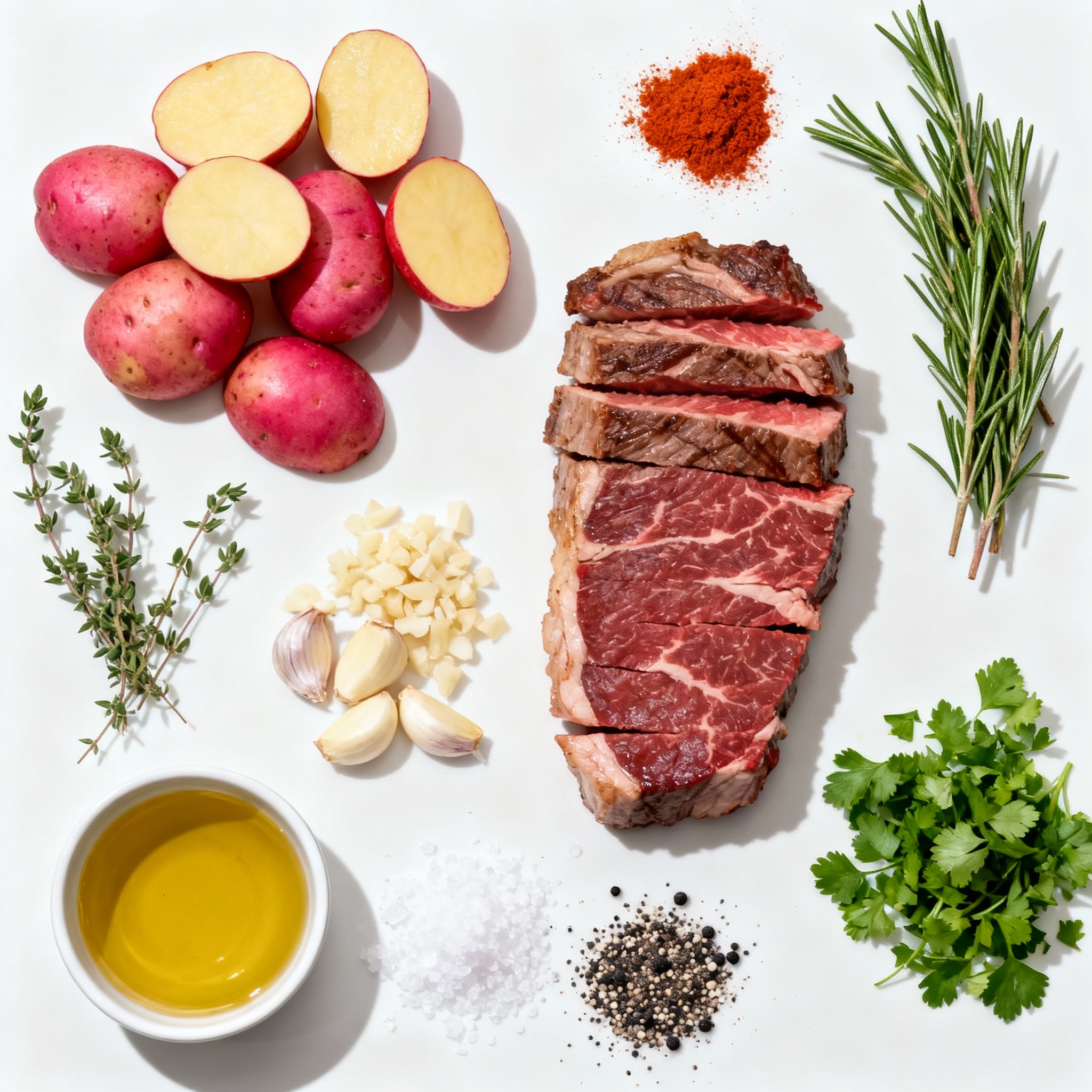 - Serve the sliced steak alongside the roasted potatoes, garnished with freshly chopped parsley for a touch of color.
