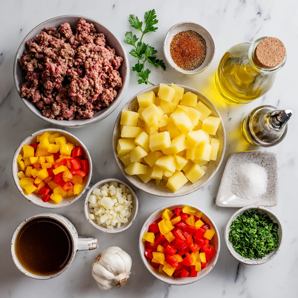 I also toss in garlic and bell pepper. They add layers of taste and a pop of color. Beef broth is key for moisture. It helps the potatoes cook and makes everything juicy.