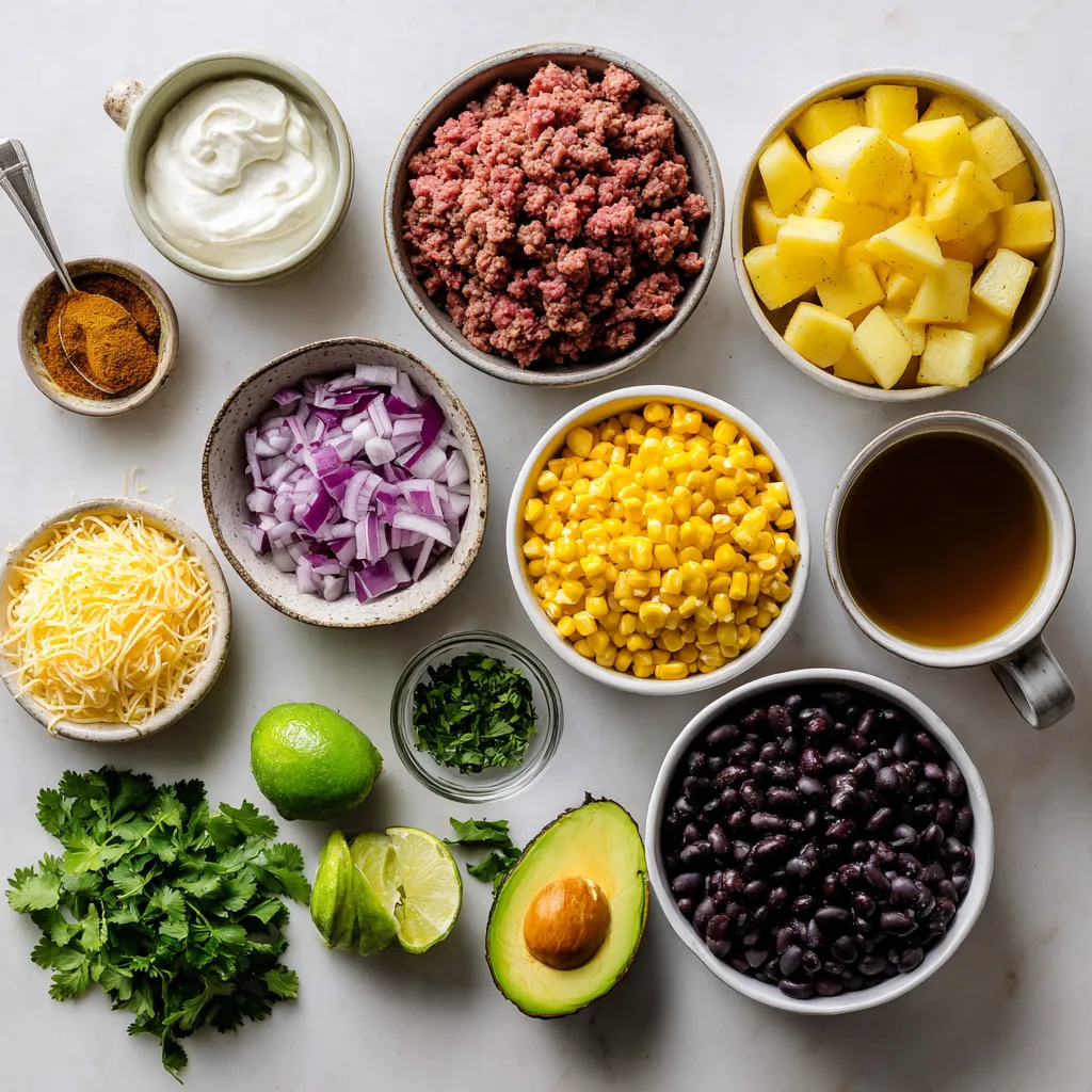 Gather these ingredients before you start cooking. The ground beef gives this dish its heartiness. The diced potatoes add a nice texture. Corn and black beans bring color and nutrition. Onion and garlic add great flavor. The spices, like chili powder and cumin, give a warm kick. Don’t forget the cheese to melt on top. The fresh cilantro, avocado, and lime will brighten the dish. This mix of ingredients makes for a tasty and satisfying meal that everyone will love.
