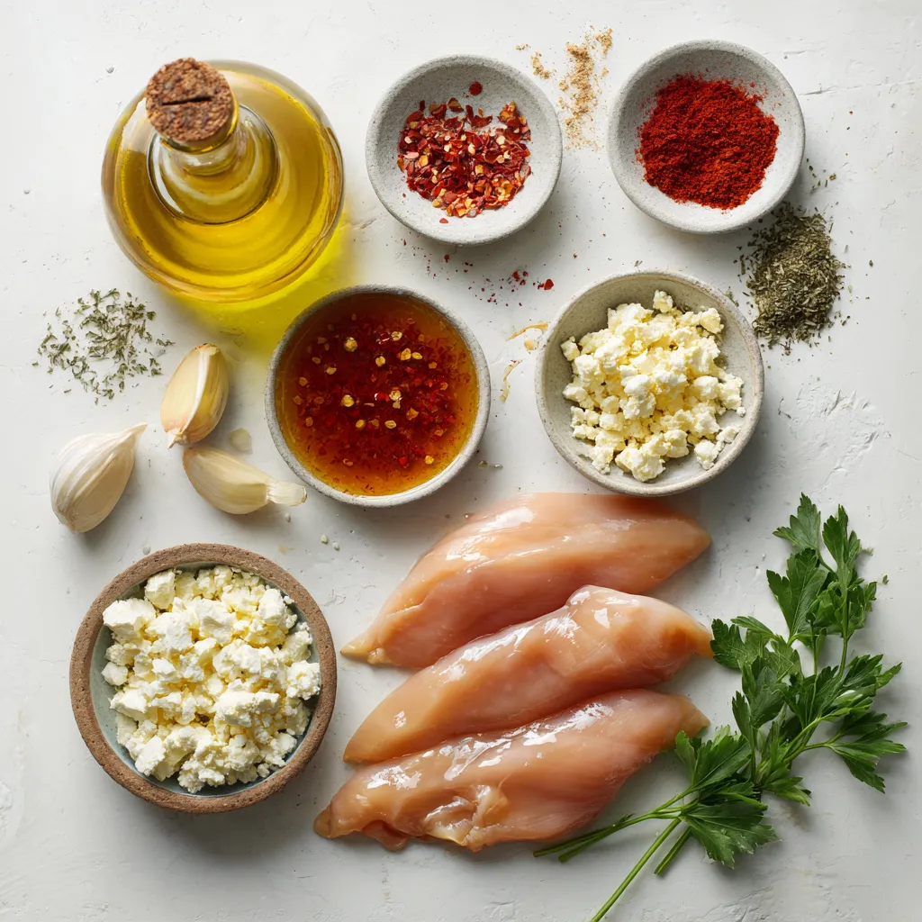 - In a baking dish, arrange the marinated chicken breasts evenly. Sprinkle feta cheese generously on top of each piece.