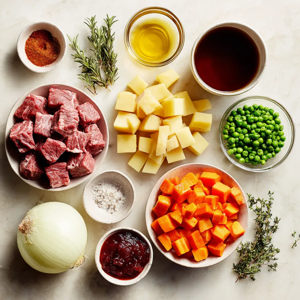 The main ingredients create a rich and hearty beef stew. Beef chuck gives the stew its depth and flavor. The carrots and potatoes add sweetness and texture. Onion and garlic bring a strong aroma to the dish. Seasonings like thyme and rosemary add warmth and earthiness. The beef broth and tomato paste form a savory base.