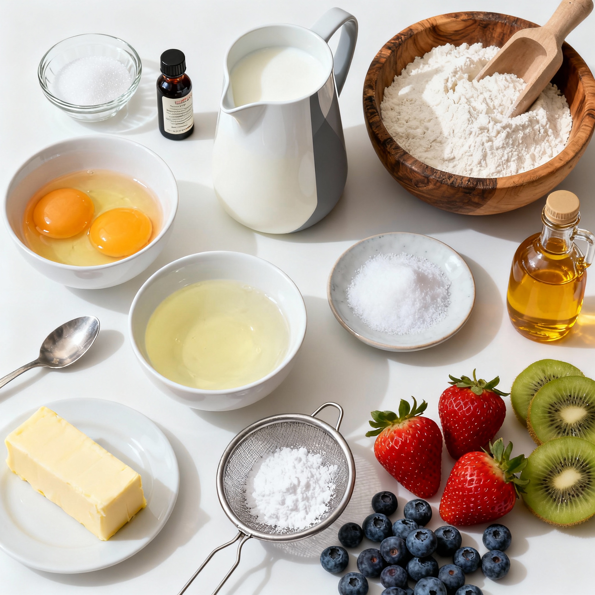 These ingredients work together to create light, fluffy pancakes. The eggs play a key role. Separating them allows you to whip the whites into a meringue, giving the pancakes their airy structure. The sugar adds sweetness and helps with the meringue's stability. Vanilla extract brings a lovely flavor, while milk makes the batter creamy. Flour and baking powder contribute to the pancake's rise. A pinch of salt balances the sweetness. Greasing the pan with butter ensures the pancakes cook evenly. Finally, powdered sugar and fresh fruit make for a beautiful and tasty presentation. Don't forget the maple syrup; it adds a rich sweetness that pairs perfectly!