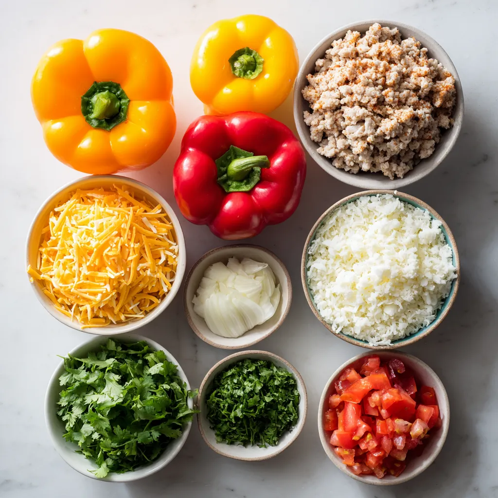 Each ingredient plays an important role. The bell peppers serve as a tasty, low-carb vessel. Ground turkey or chicken provides protein. Cauliflower rice keeps this dish keto-friendly while adding texture.