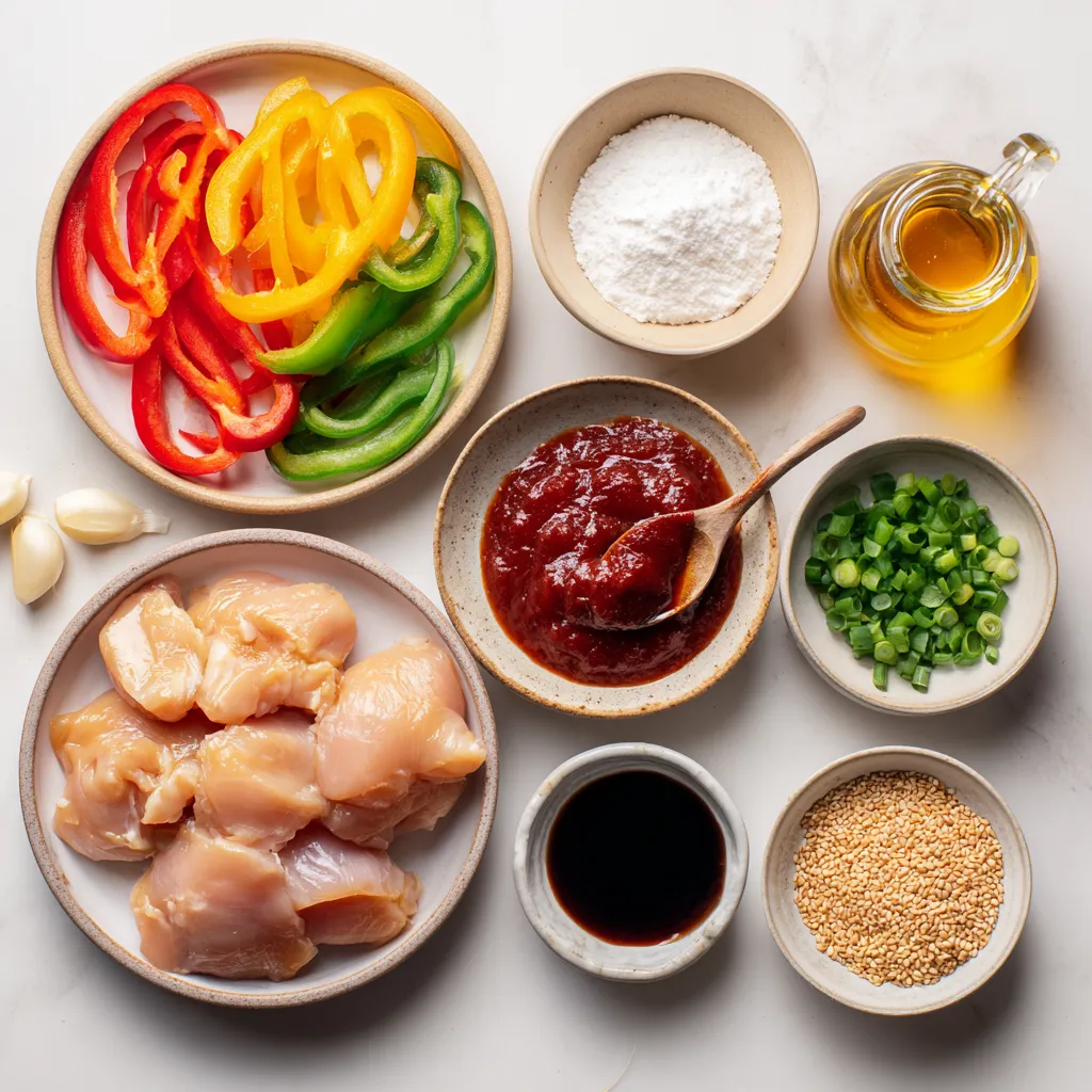 Start by slicing 500g of boneless chicken thighs into bite-sized pieces. Place the chicken in a medium bowl. Sprinkle 1 tablespoon of cornstarch over the chicken. Toss it well to coat each piece. This coating helps the chicken get crispy when cooked. Next, slice 1 cup of bell peppers into strips. You can use red, green, and yellow for color. Slice 1 medium onion into thin pieces. Set these aside for later.