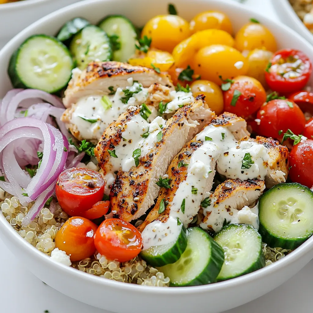 Distribute toppings like feta and olives evenly for balanced bites. Lastly, drizzle the dressing right before serving to keep everything fresh. If you want, let the bowl sit for 30 minutes in the fridge. This helps the flavors blend together nicely. Enjoy every bite of your delicious creation!