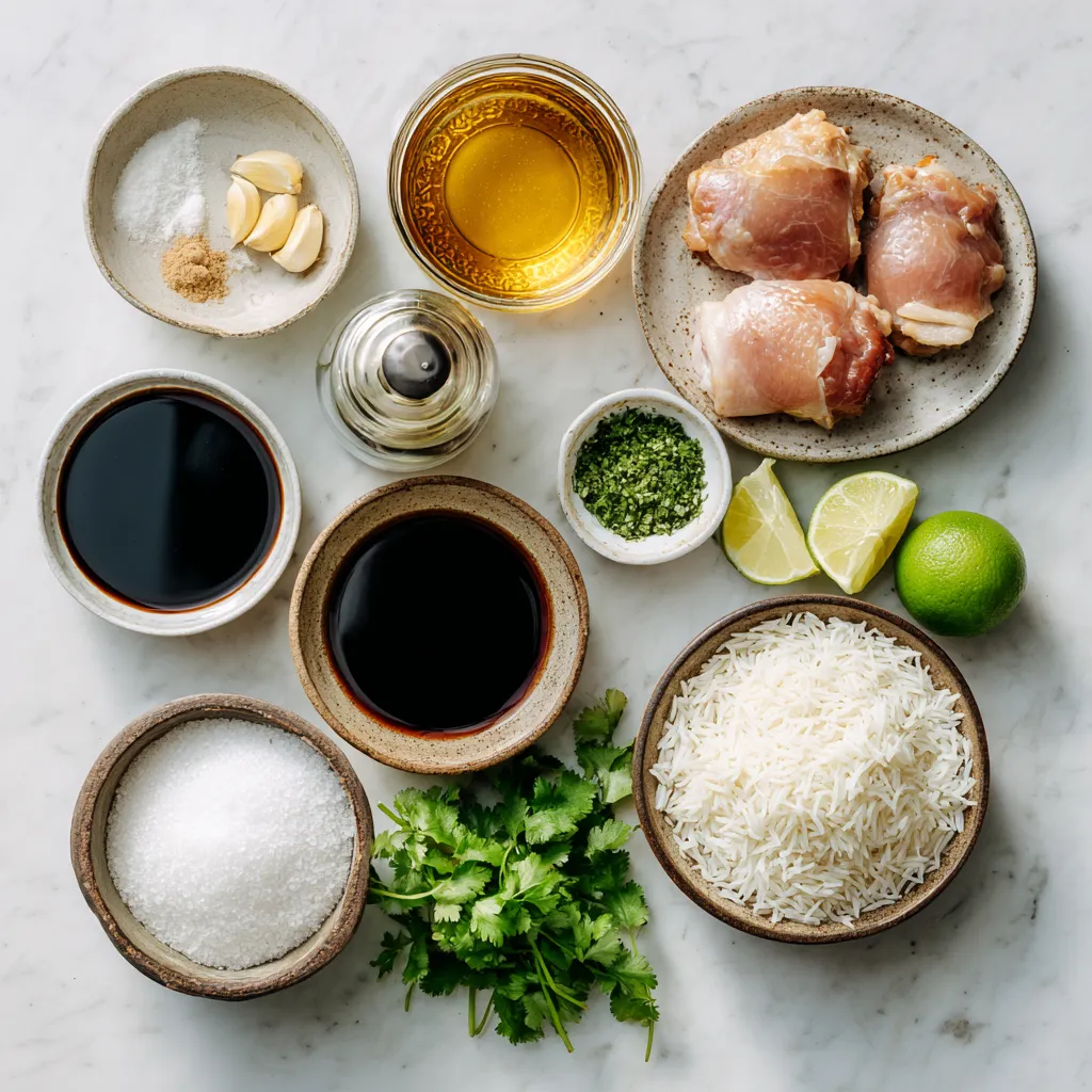 Gather these ingredients to make your Maple Chicken with Coconut Rice. The chicken thighs give a nice texture. The marinade brings out sweet and savory flavors. The coconut rice adds a creamy touch, making it a unique dish. Keep the ingredients ready to start cooking!