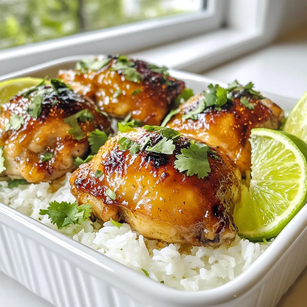 To serve, place a scoop of coconut rice on each plate. Top with the glazed chicken. Drizzle any leftover sauce over the chicken. For a fresh touch, sprinkle chopped cilantro on top. Add lime wedges on the side for a zesty kick!