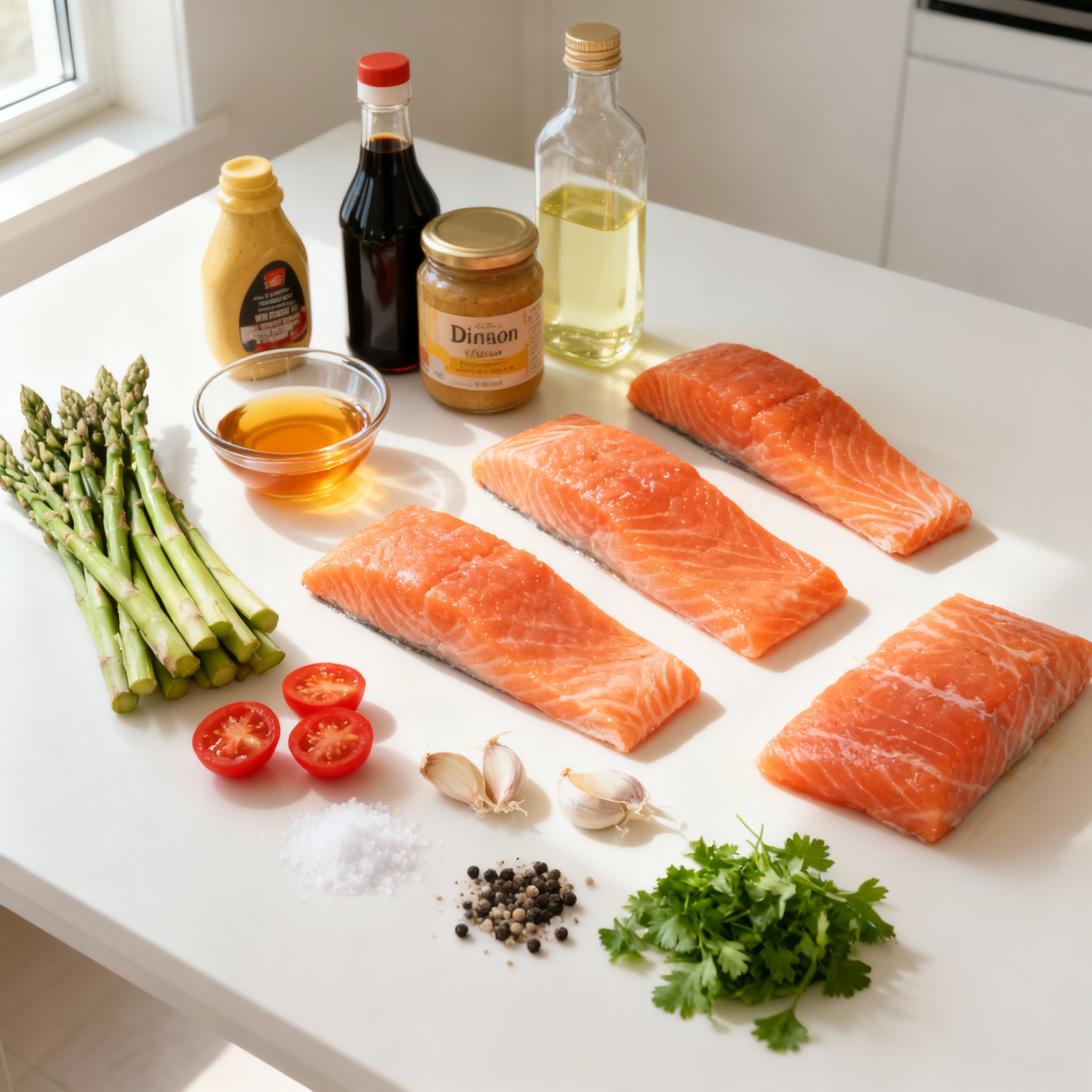 First, I set my oven to 400°F (200°C). This heat gives the salmon a nice cook. While it heats, I gather all my ingredients. I measure out ¼ cup of pure maple syrup, 2 tablespoons of soy sauce, and 1 tablespoon of Dijon mustard. I also grab 1 tablespoon of olive oil. Next, I rinse 4 salmon fillets and place them on a baking sheet lined with parchment paper. I season them with salt and pepper.
