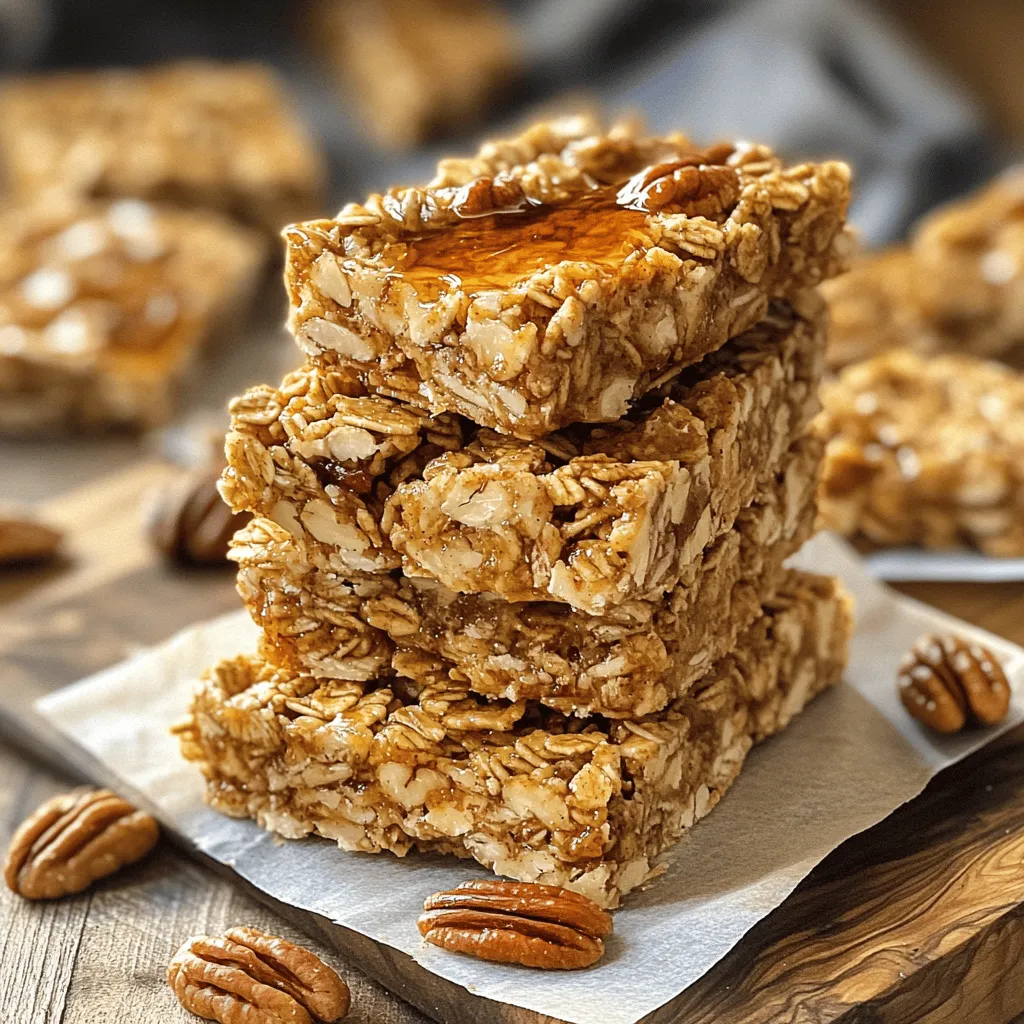 ![- 2 cups rolled oats - 1 cup pecans, chopped - ½ cup almond butter (or any nut butter) - ⅓ cup pure maple syrup - ¼ cup honey (or agave syrup for a vegan option) - ½ teaspoon vanilla extract - ½ teaspoon cinnamon - ¼ teaspoon salt - ½ cup dried cranberries or raisins (optional) - ¼ cup mini dark chocolate chips (optional) The star of this recipe is the maple syrup. It gives the bars a sweet and rich flavor that pairs perfectly with the pecans. You can switch almond butter for another nut butter, depending on your taste. The oats offer a chewy texture, making every bite satisfying. When making these bars, consider adding dried fruit or chocolate chips for extra flavor. Dried cranberries add a tartness that balances the sweetness of the maple syrup. Mini dark chocolate chips bring a touch of indulgence that kids and adults love. Each bar has about 150 calories. They contain 4 grams of protein, 7 grams of fat, and 20 grams of carbohydrates. This makes them a great snack option for energy without a sugar crash. You can easily make these bars vegan by using agave syrup instead of honey. For a nut-free version, swap nut butter with sunflower seed butter. To keep them gluten-free, ensure your oats are certified gluten-free. This way, everyone can enjoy a delicious and healthy snack! - Preheat your oven to 350°F (175°C). - Line an 8x8 inch baking pan with parchment paper. - In a large bowl, mix 2 cups rolled oats and 1 cup chopped pecans. - Spread this mix on a baking sheet. - Toast the mixture in the oven for about 10 minutes. Stir halfway through. - In a saucepan over low heat, combine: - ½ cup almond butter - ⅓ cup pure maple syrup - ¼ cup honey - ½ teaspoon vanilla extract - ½ teaspoon cinnamon - ¼ teaspoon salt - Stir the mix for 3-5 minutes until smooth. - Remove the toasted oats and pecans from the oven and let cool slightly. - Pour the warm almond butter mix over the oat and pecan mix. - If desired, add ½ cup dried cranberries and ¼ cup mini dark chocolate chips. - Use a spatula to stir everything until well coated. - Transfer the granola mix into the prepared baking pan. - Press the mixture firmly into the pan using a spatula or your hands. - Bake for 15-20 minutes until the edges start to brown. - Allow the bars to cool in the pan for about 10 minutes. - Lift them out using the parchment paper and let cool completely. - Once cool, cut into bars of your desired shape and size. For the complete recipe details, check the [Full Recipe]. To keep your granola bars fresh, store them in an airtight container. Place parchment paper between layers to avoid sticking. They stay good for about a week at room temperature. For longer storage, you can freeze them. Wrap each bar in plastic wrap and place them in a freezer bag. They will last for up to three months in the freezer. For a fun presentation, stack your granola bars on a wooden board. Add some extra pecans on top and drizzle with maple syrup. This gives a nice rustic look. You could also wrap each bar in parchment paper for easy snacks on the go. Pair these bars with yogurt or fresh fruit for a great breakfast or snack! A common mistake is not pressing the mixture firmly enough in the pan. This can lead to crumbly bars. Make sure to press it down well before baking. You can also customize your bars. Try adding different nuts, seeds, or dried fruits to match your taste. If you love chocolate, toss in some dark chocolate chips. This will add richness and flavor to your bars! For the full recipe, check the section above. {{image_2}} You can easily change the flavor of these bars. Adding different nuts or seeds makes a big difference. Try walnuts, almonds, or sunflower seeds. Each nut brings a unique taste and texture. You can also switch up the sweetener. Instead of maple syrup, use maple sugar or brown sugar for a new flavor. If you want to use a different nut butter, go ahead! Peanut butter works well and adds a nice taste. You can even try sunflower seed butter for a nut-free option. Changing sweeteners can also help. Use agave syrup instead of honey for a vegan choice. This keeps the bars tasty and suitable for everyone. You can make these bars fit many diets. For a gluten-free version, choose gluten-free oats. This keeps the bars safe for those with gluten issues. If you prefer a keto diet, swap the oats with crushed nuts or seeds. This adds healthy fats and keeps carbs low. For a high-protein option, add protein powder to the mix. This boosts the protein and helps you feel full longer. You can find many brands that sell maple pecan granola bars. Some popular options include Nature Valley, KIND, and Larabar. Each brand offers a unique flavor and texture. I recommend checking the ingredient list. Look for bars with whole ingredients and minimal added sugar. You can find these bars in grocery stores or online. Websites like Amazon and Thrive Market often have great selections. Making your own granola bars has benefits. You control the ingredients, so you can skip preservatives. You can also adjust flavors to your taste. However, making them takes time and effort. Store-bought bars are quick and easy, but they might cost more. Homemade bars are cheaper in the long run, especially with bulk ingredients. You can make a large batch to save money and have snacks ready. Here are some brands you might enjoy: - KIND: Known for its crunchy texture and clean ingredients. - Nature Valley: Offers a variety of flavors but often has added sugars. - RXBAR: Great for protein, but check for nut allergies. - Larabar: A simple ingredient list, perfect for a quick snack. These brands balance great taste and nutrition. When shopping, read the labels for the best choice. Homemade granola bars can last up to two weeks. Store them in an airtight container. Keep them in a cool, dry place. You can also freeze them for up to three months. Just wrap each bar tightly in plastic wrap or foil before freezing. Yes, you can make these bars nut-free. Us