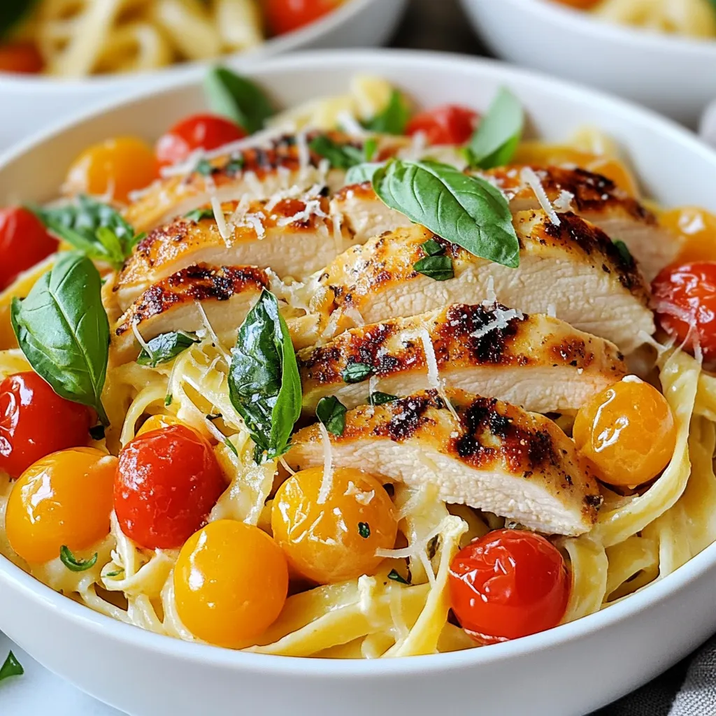 For a lovely presentation, slice the rested chicken breasts and lay them over the pasta. To finish, garnish with fresh basil leaves. This adds a nice touch and flavor. Serve the dish in deep bowls, and consider adding extra parmesan and a drizzle of olive oil on top. Enjoy your meal!
