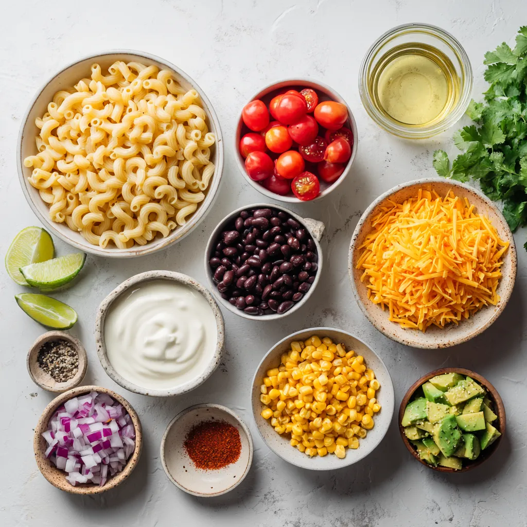 To make a vibrant Mexican macaroni salad, you need fresh and colorful ingredients. Elbow macaroni serves as the base, giving a comforting feel. Cherry tomatoes add sweetness and a burst of color. Black beans bring protein and fiber. Sweet corn adds a touch of sweetness and crunch.