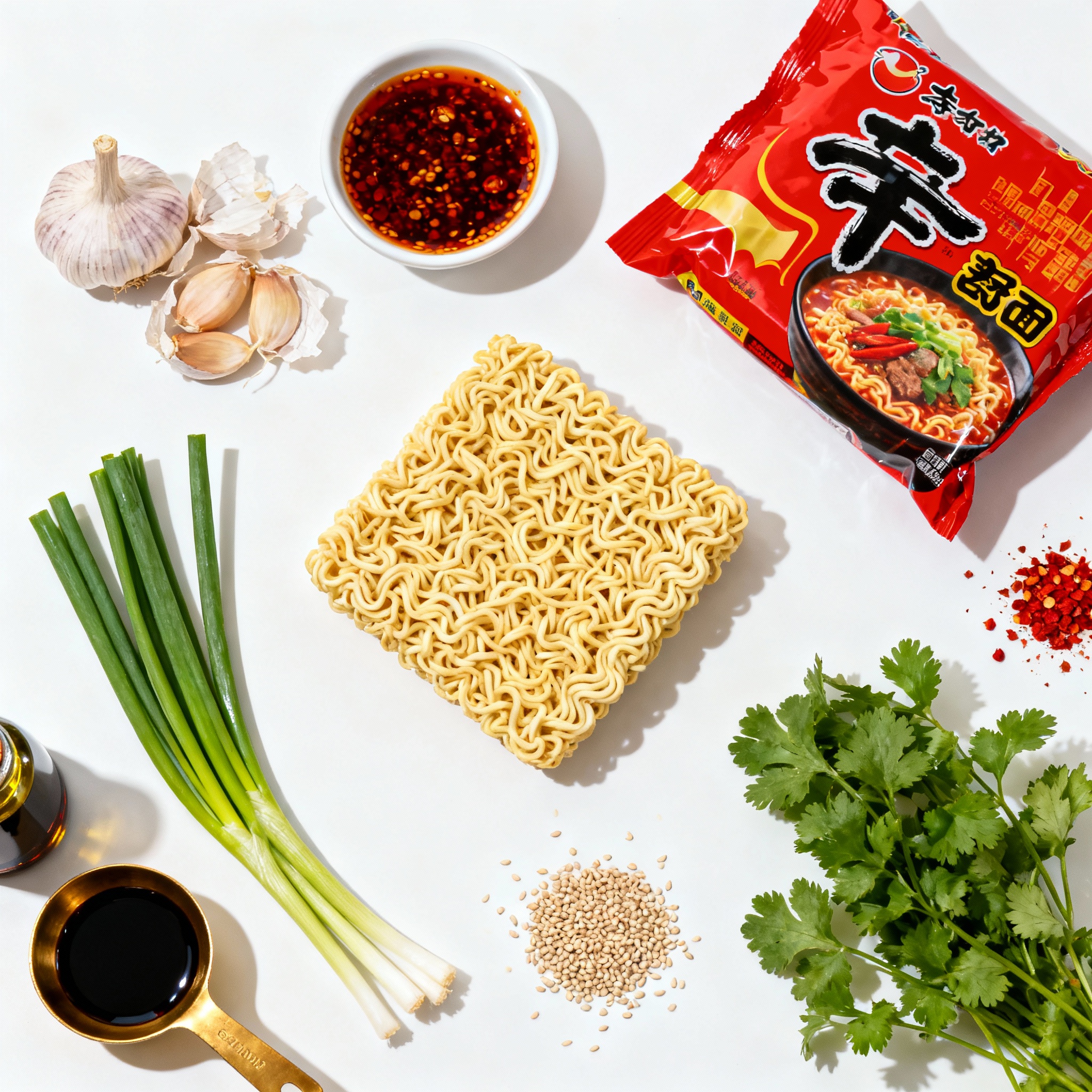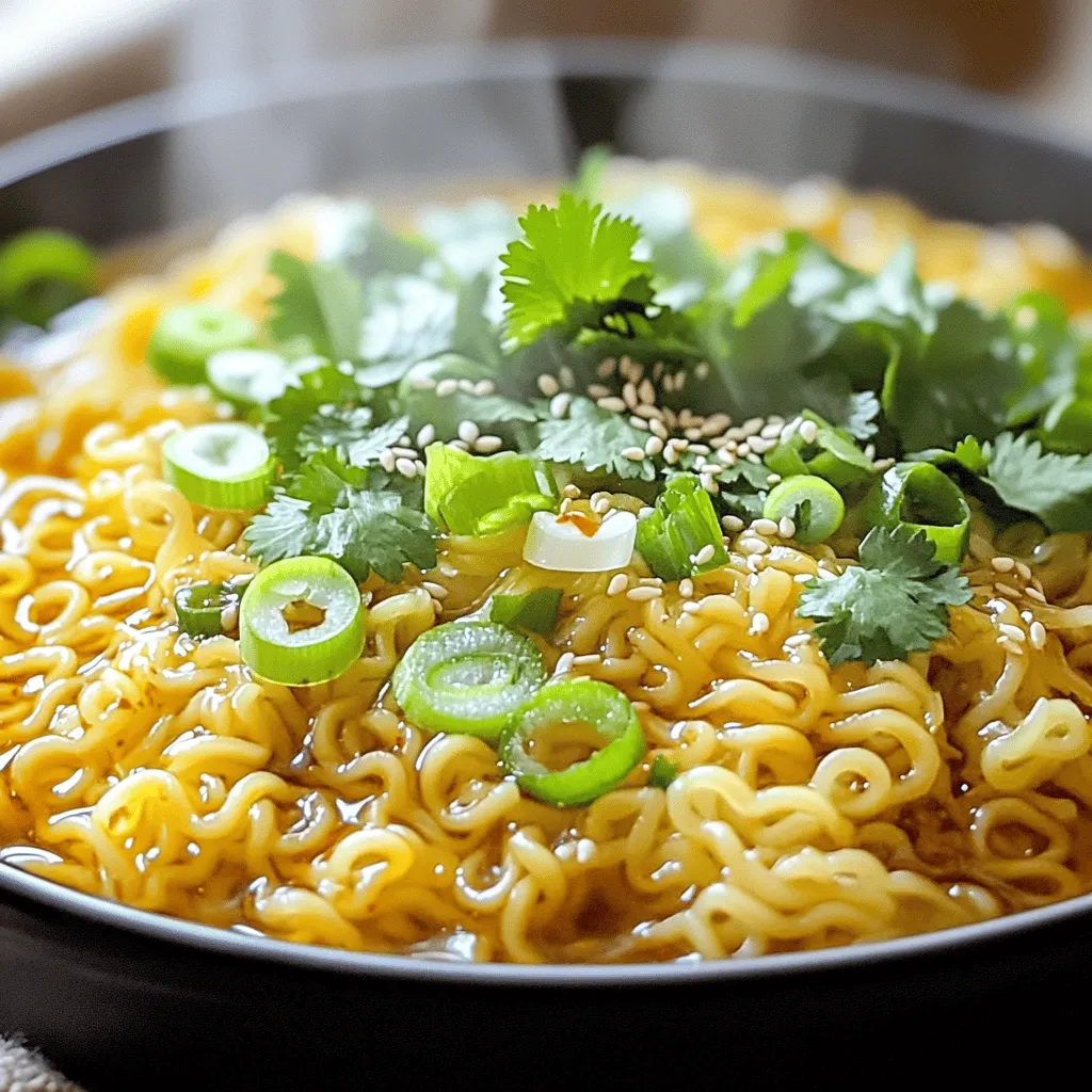 You need simple ingredients for this tasty dish. Instant ramen noodles are quick and easy to find. Fresh garlic packs a punch of flavor. Chili oil adds heat and richness. Soy sauce gives depth, while sesame oil adds a hint of nuttiness. Green onions brighten the dish with color and taste. For a fun touch, sesame seeds and cilantro work great as garnishes. Crushed red pepper flakes let you adjust the spice to your liking. This mix allows you to create a warm and satisfying meal.