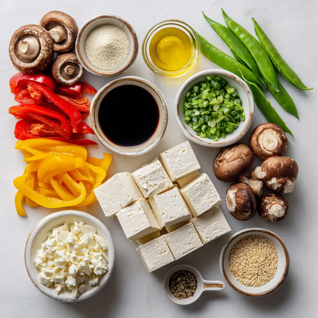 Gather these ingredients for a tasty Mushroom Tofu Stir Fry. The firm tofu gives a nice texture, while assorted mushrooms add rich flavors. Fresh vegetables like bell pepper and snap peas provide crunch and color. The garlic and ginger bring warmth, and the soy sauce or tamari adds depth. You can finish the dish with sesame seeds for a touch of flair. Make sure to adjust salt and pepper to your liking!