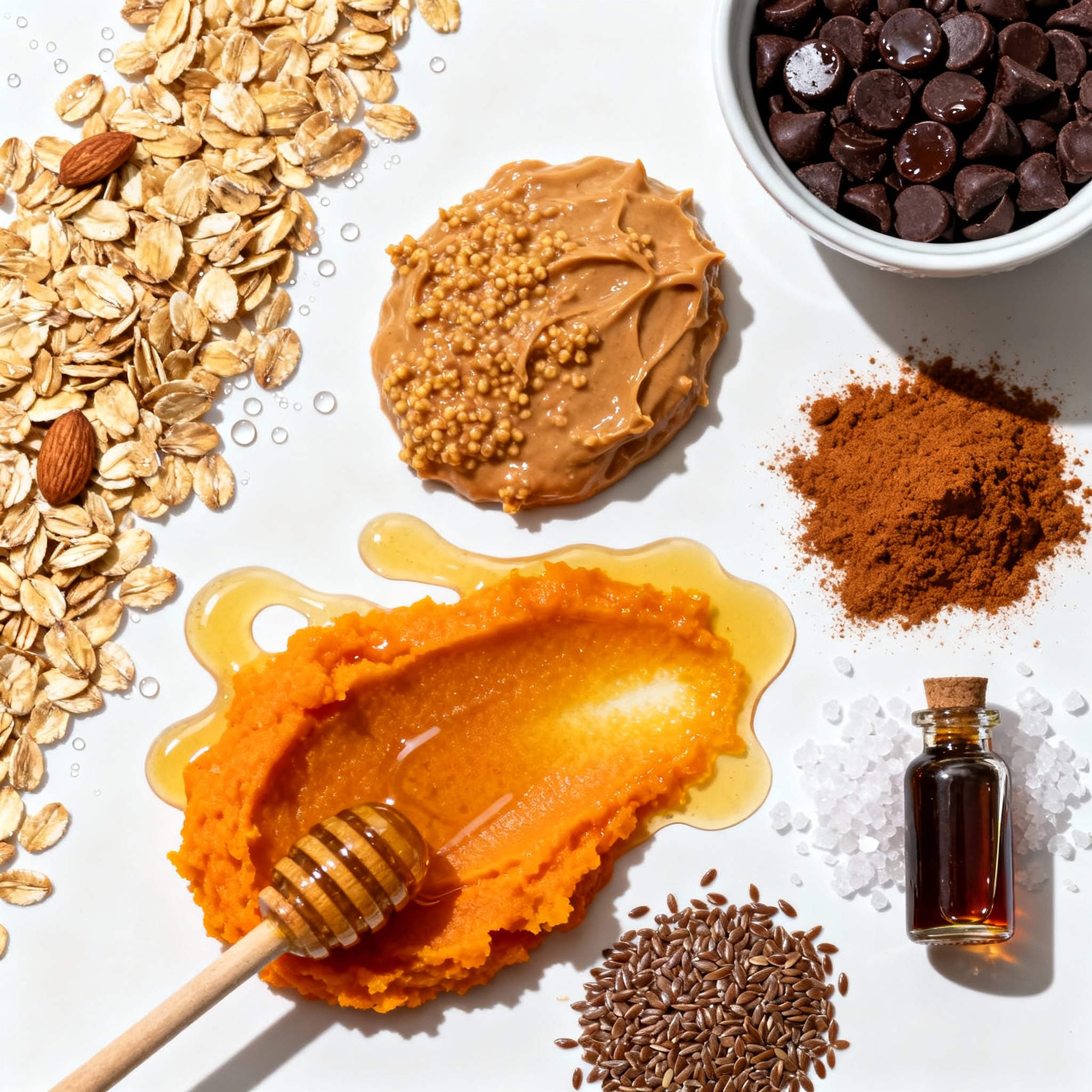 To start, gather all your ingredients. You need rolled oats, almond butter, pumpkin puree, honey, ground flaxseed, pumpkin spice, vanilla extract, and mini chocolate chips if you want. In a large bowl, mix the rolled oats, almond butter, pumpkin puree, and honey or maple syrup. Stir until everything blends well. This step is key for a tasty base.
