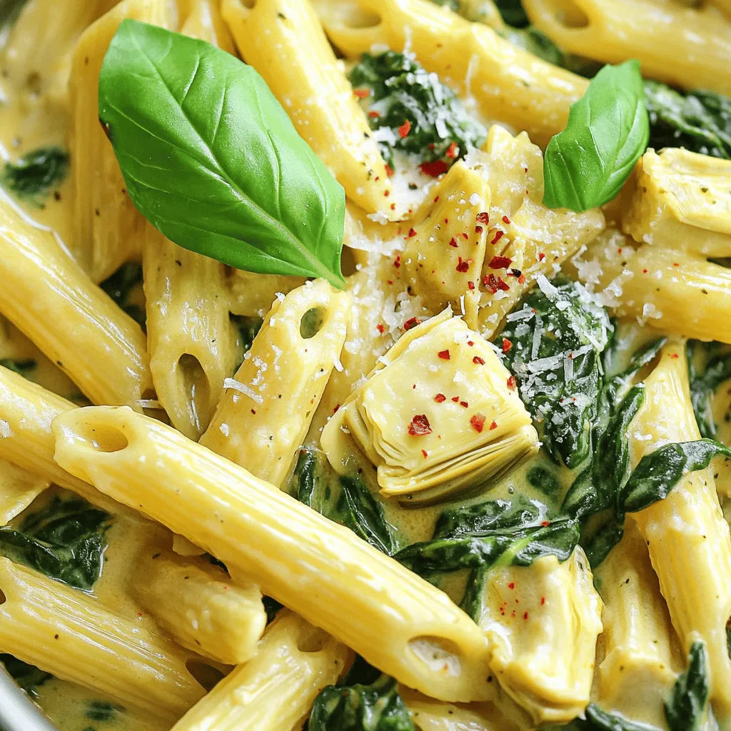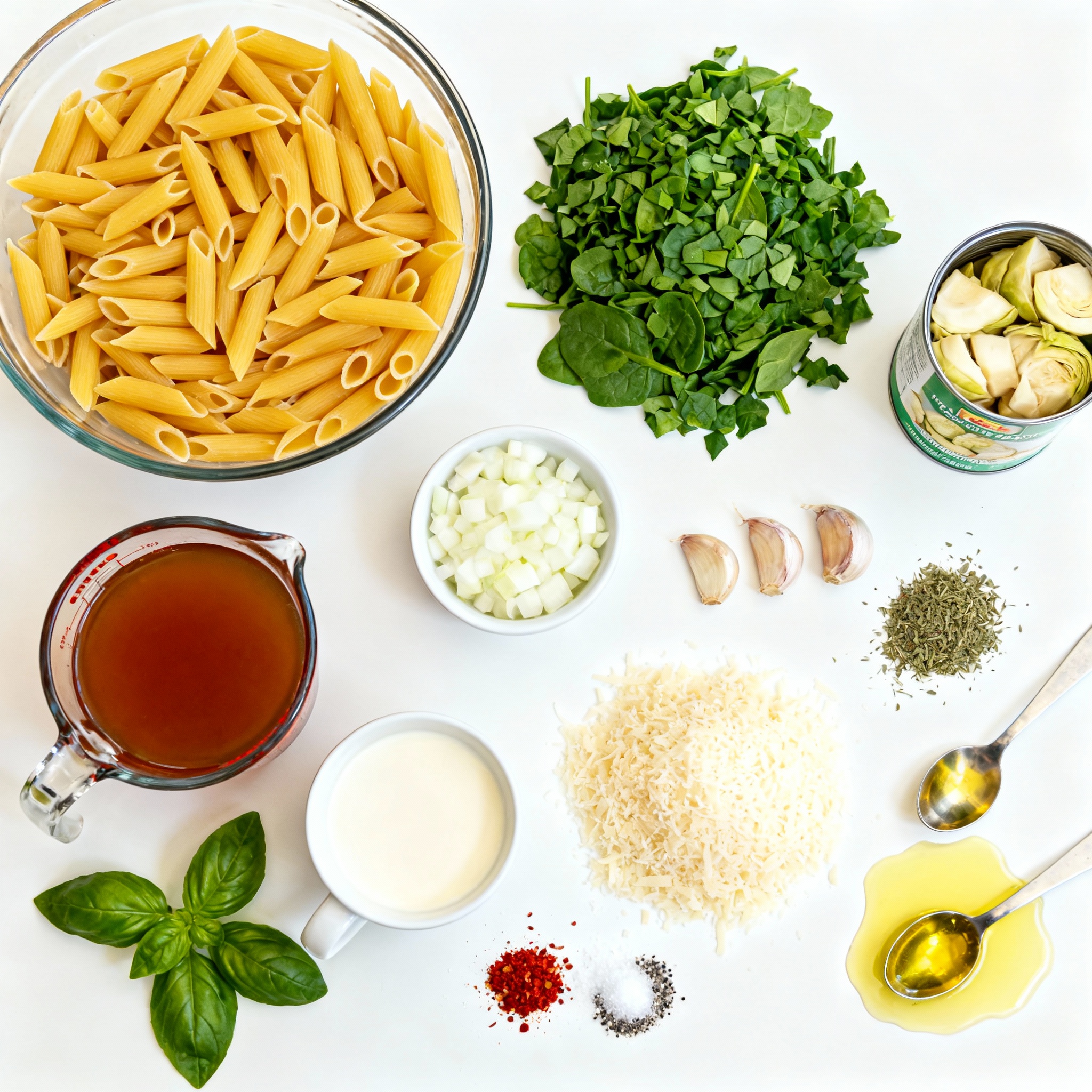 First, the penne pasta serves as the base. It holds the creamy sauce and flavors well. Fresh spinach adds a bright green touch and nutrients. Artichoke hearts bring a tasty, unique flavor. Garlic and onion provide a strong aroma and depth to the dish.