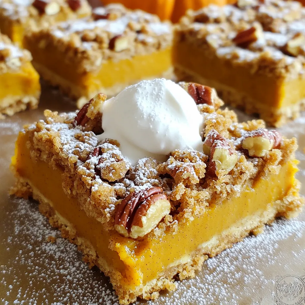 Once baked, let the bars cool in the pan on a wire rack. This helps them firm up. After cooling, lift the bars out using the parchment paper. Cut them into squares. For extra flair, dust with powdered sugar or serve with whipped cream. Enjoy your delicious pumpkin pie streusel bars!