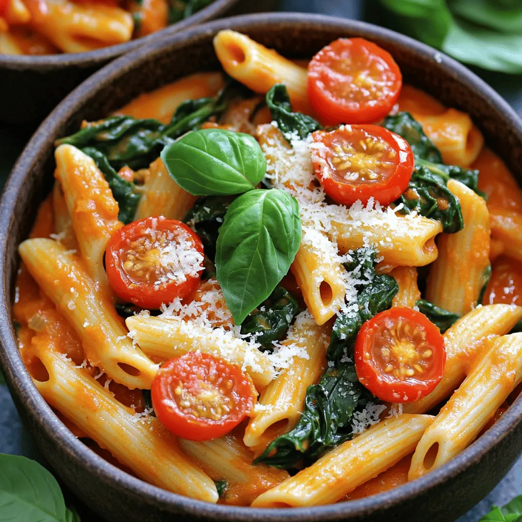 Now, it’s time to add the sauce. Pour in your blended roasted red pepper sauce. Stir in the heavy cream, dried basil, oregano, salt, and pepper. Mix well. Then, add the penne pasta. Stir to coat it evenly. Bring the mixture to a gentle simmer. Cover the pot and cook for about 10 to 12 minutes. Stir occasionally until the pasta is al dente. Once done, mix in the cherry tomatoes and fresh spinach. Cook for another 2 minutes, just until the spinach wilts. If you want, add grated Parmesan cheese and stir until it melts. Enjoy the creamy goodness!