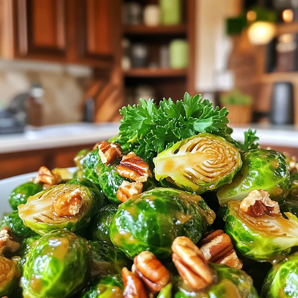 It’s time to cook! Preheat your air fryer to 375°F (190°C). While it heats, toss the halved Brussels sprouts in the maple Dijon sauce. Make sure they are well-coated. Then, place the sprouts in a single layer in the air fryer basket. Try not to overcrowd them for even cooking. Now, air fry the Brussels sprouts for 15 to 18 minutes. Shake the basket halfway through for great results. They should turn crispy and golden brown. Once done, transfer them to a serving dish. If you want, sprinkle toasted pecans on top. Garnish with fresh parsley for a pop of color. Enjoy your tasty dish!