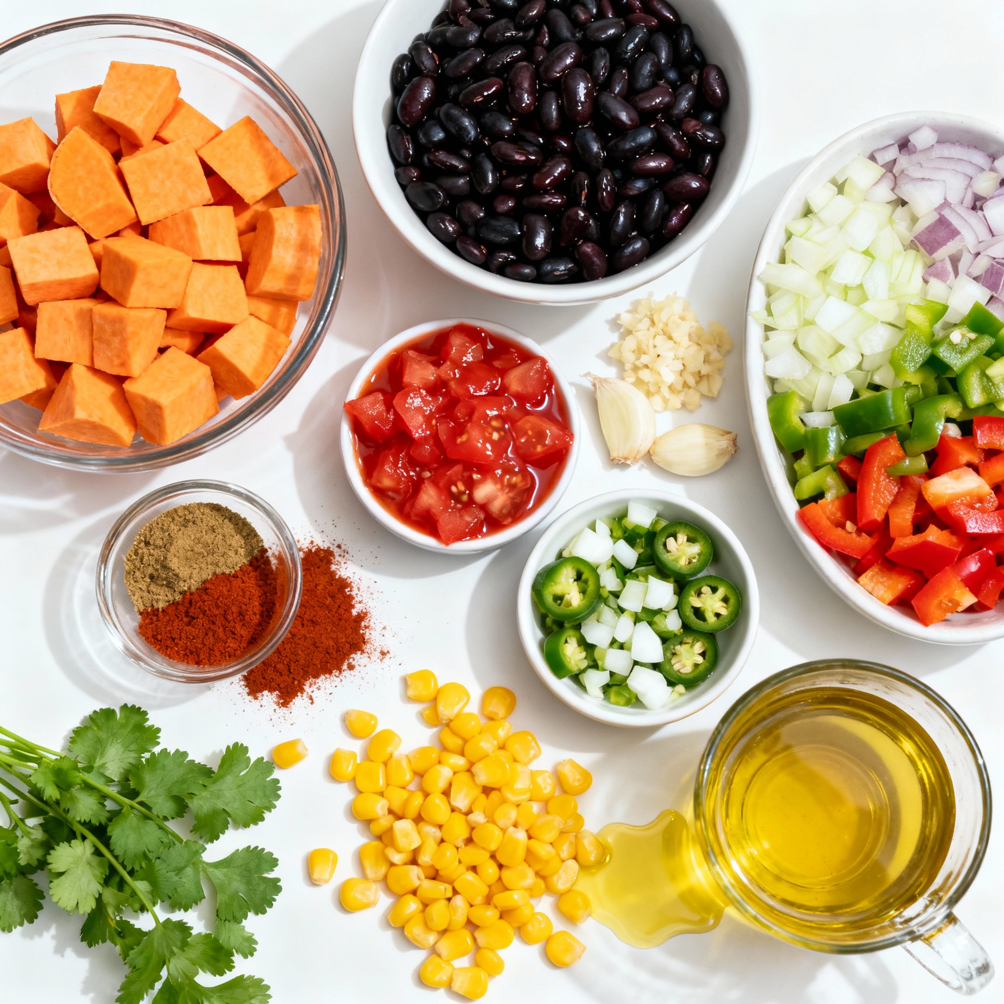 Start with sweet potatoes. They add a nice sweetness and texture. Black beans give protein and fiber. Diced tomatoes bring moisture and flavor. You can use any color bell pepper. They add crunch and sweetness. Jalapeños give heat, but adjust to your taste.