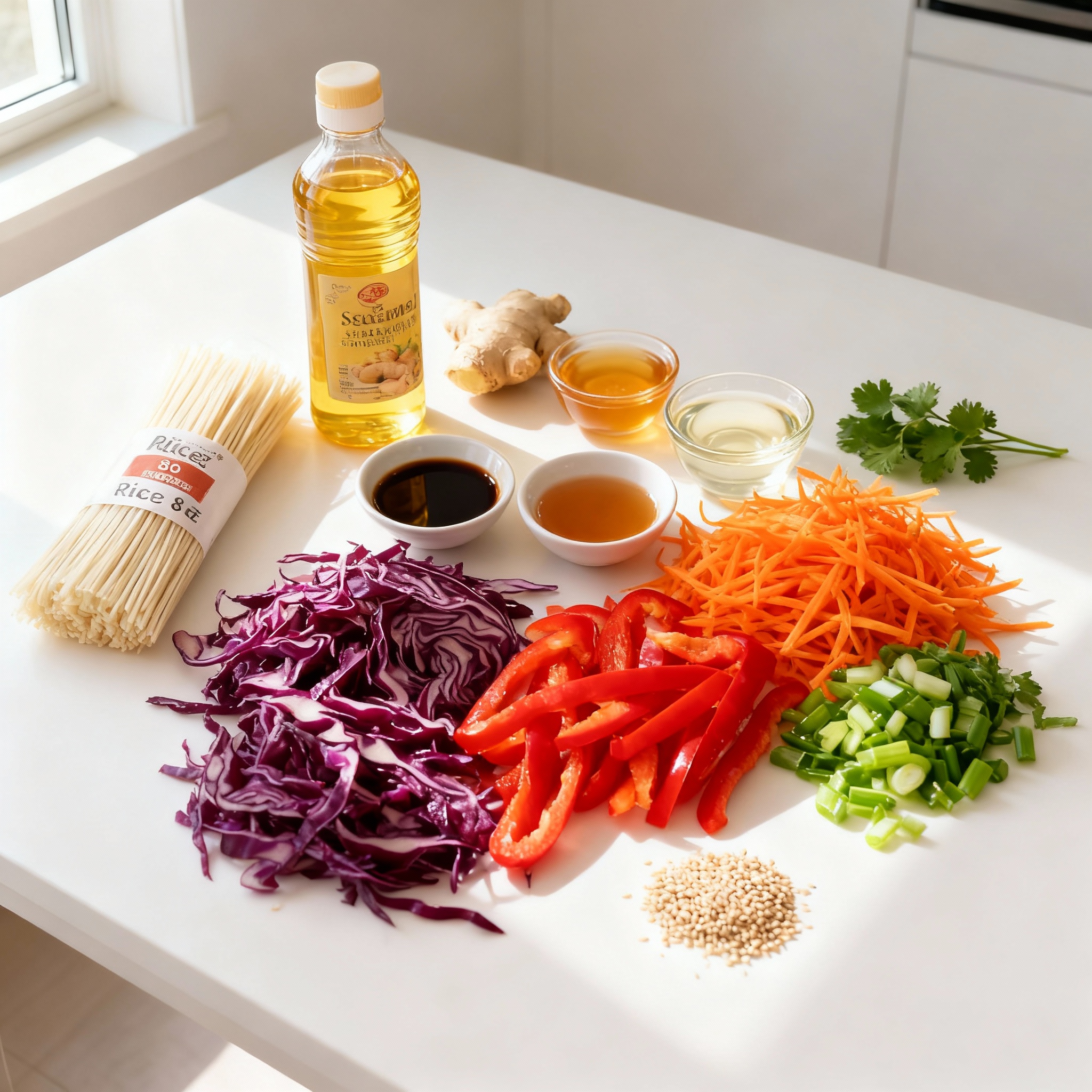 - Combine Vegetables: In a large mixing bowl, add the shredded carrots, sliced red cabbage, bell pepper, and chopped green onions. Toss the vegetables together to mix well.