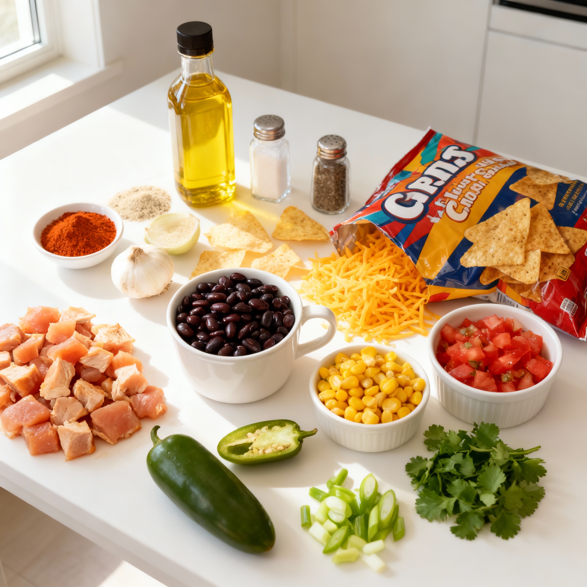 - Sprinkle half of the shredded cheddar cheese over the chips, followed by the shredded chicken, black beans, corn kernels, jalapeño slices (if using), and diced tomatoes.