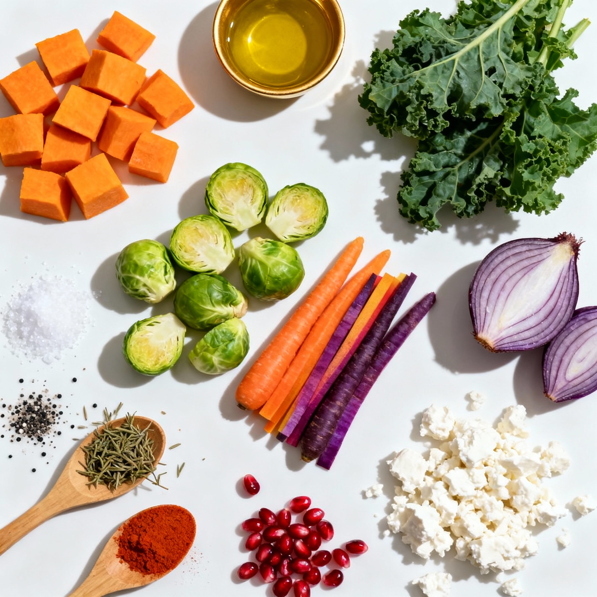 Preheat your oven to 425°F (220°C). Spread the veggie mix in a single layer on a baking sheet lined with parchment paper. Make sure there is space between the veggies. This helps them roast better. Place the baking sheet in the oven. Roast for 25 to 30 minutes. Stir the veggies halfway through to ensure even cooking. When the veggies are golden brown and tender, take them out. Add one cup of baby kale and fold it in gently. The heat will wilt the kale. Plate the veggies and top with pomegranate seeds and feta cheese if you like. Enjoy your colorful and tasty dish!