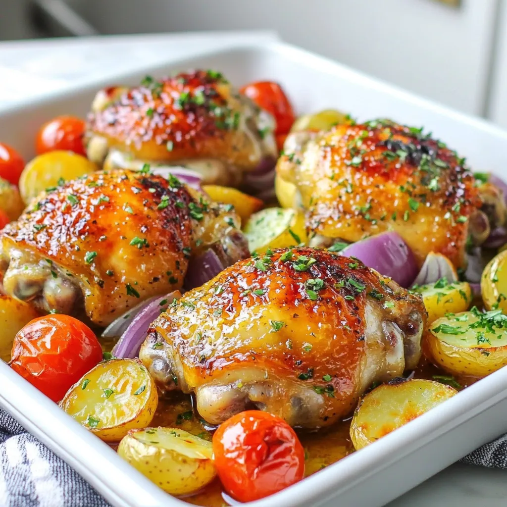 - On a large sheet pan, arrange the marinated chicken thighs in the center. Scatter the red onion wedges and halved baby potatoes around the chicken. Drizzle any remaining marinade over the vegetables, ensuring they're well coated.