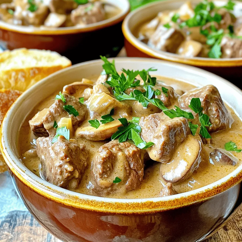 For serving, present the beef stroganoff in deep bowls. A sprinkle of chopped fresh parsley on top adds color and freshness. Serve it over cooked egg noodles or rice. Crusty bread on the side is great to soak up the delicious sauce. Enjoy your meal!