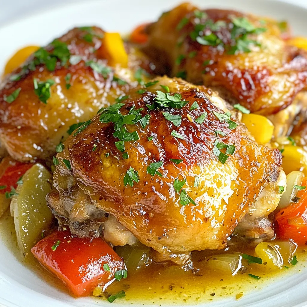 Now, return the chicken thighs to the skillet, skin-side up. Reduce the heat to low, cover the skillet, and let it simmer. Cook for about 30 minutes until the chicken is fully cooked and tender.
