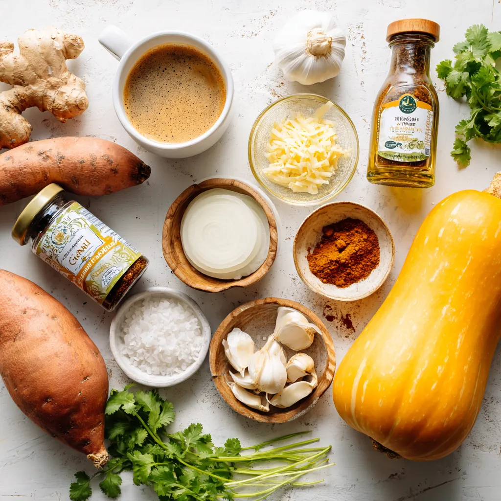 The star of this soup is the butternut squash. It adds a sweet and creamy base. Sweet potatoes bring more sweetness and nutrition. Together, these two create a rich flavor. Onion, garlic, and ginger add depth and warmth.