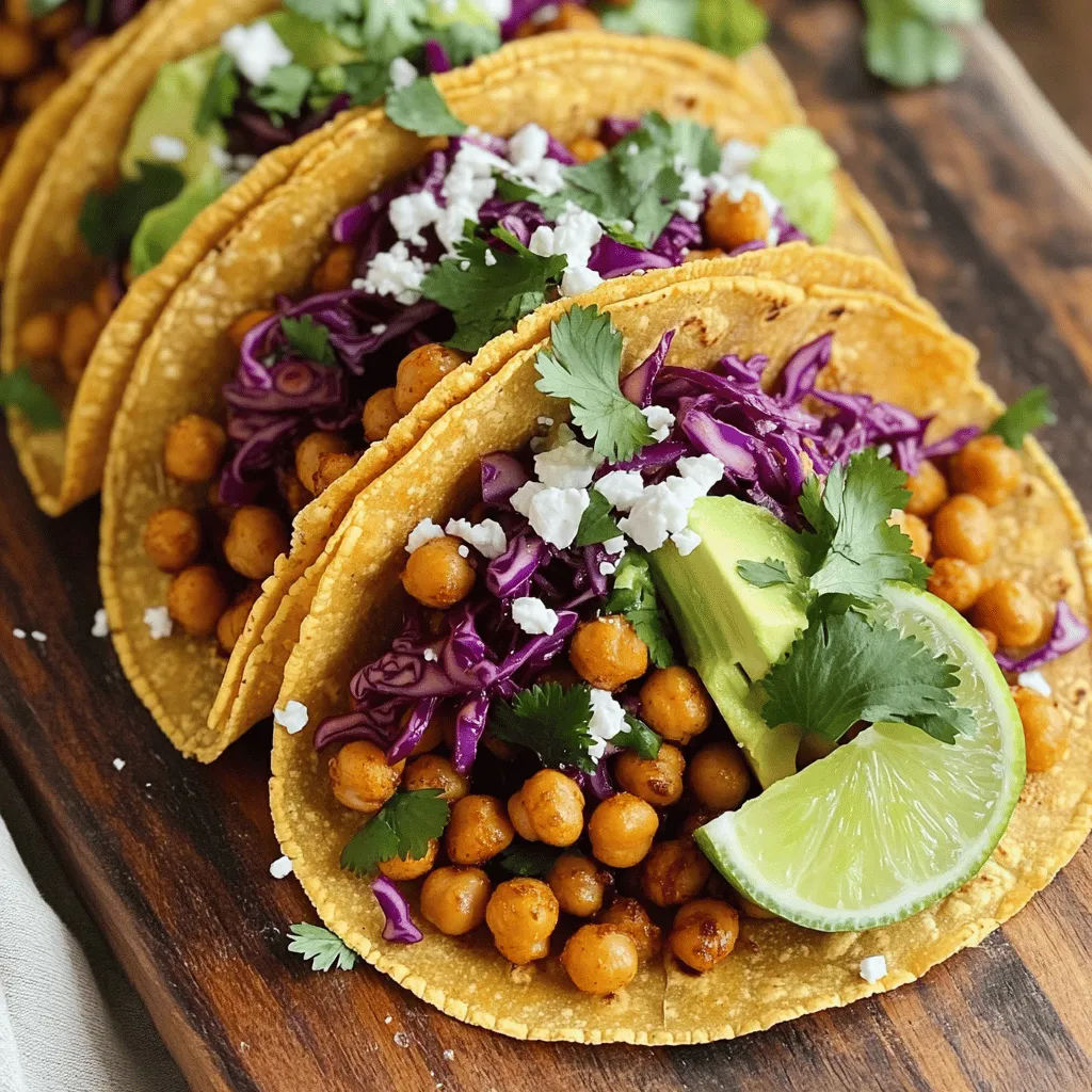 ![- 1 can (15 oz) chickpeas - 1 tablespoon olive oil - Spices: smoked paprika, ground cumin, chili powder, cayenne pepper - Toppings: shredded red cabbage, avocado, cilantro, feta cheese (optional) These ingredients create a tasty base for your spicy chickpea tacos. Chickpeas give you protein and fiber. Olive oil adds healthy fat and helps the spices stick. You can serve the tacos with various sauces and sides for extra flavor. Try adding hot sauce for heat. A side of rice or a simple salad works well too. To enhance nutrition, add more veggies. Chopped tomatoes or diced bell peppers add color. They also boost vitamins. You can mix and match to suit your taste. For the full recipe, check the complete details to create these delicious tacos. First, preheat your oven to 400°F (200°C). This step is key for crispy chickpeas. Next, you need to mix the chickpeas with olive oil and spices. In a large bowl, add the drained chickpeas. Pour in one tablespoon of olive oil. Then, add one teaspoon of smoked paprika, one teaspoon of ground cumin, and half a teaspoon of chili powder. If you like heat, add a quarter teaspoon of cayenne pepper. Finish with salt and pepper to taste. Toss everything well to coat the chickpeas evenly. Now, spread the chickpeas on a baking sheet in a single layer. This helps them roast evenly. Place the baking sheet in the oven and roast for about 20 to 25 minutes. Stir them halfway through to ensure they get crispy all around. You’ll know they are done when they turn golden and crunchy. While the chickpeas are roasting, it’s time to warm your tortillas. You can do this in a skillet over medium heat. Heat each tortilla for about 30 seconds on each side. This makes them soft and easy to fold. Keeping them warm means they won’t crack when you fill them. Once the chickpeas are crisp, take them out of the oven. Start building your taco by laying a generous amount of crispy chickpeas onto each tortilla. Next, top them with shredded red cabbage for crunch. Add sliced avocado for creaminess and sprinkle with fresh cilantro. For extra flavor, drizzle lime juice over the top. If you want it creamier, add crumbled feta cheese. Now your tacos are ready to enjoy! For the full recipe, check out the [Full Recipe]. To adjust the spice levels in your tacos, start by tasting the spices as you mix. If you like it hot, add more cayenne pepper. For milder tacos, use less. You can also add more lime juice to balance the heat. Remember, everyone has different preferences, so taste as you go. It’s fun to find the right mix for you! To keep your roasted chickpeas fresh, store them in an airtight container. They will stay crunchy for about three days. If they lose their crunch, try reheating them in the oven for a few minutes. For tacos, assemble only what you will eat. Store leftover toppings separately to keep them fresh. You can use leftovers for salads or wraps, too! To elevate the taste of your tacos, consider adding more toppings. Fresh mango or pineapple can give a sweet kick. You might sprinkle some jalapeños for extra heat. Try adding a dollop of yogurt or sour cream for creaminess. Mix in some spices like coriander or garlic powder to the chickpeas for added depth. There are endless ways to make your tacos unique! For the full recipe, refer to the [Full Recipe]. {{image_2}} For a plant-based twist, use lentils instead of chickpeas. Lentils cook fast and pack protein. You can also try black beans or pinto beans for a different flavor. If you want a meat-like texture, consider jackfruit. It soaks up spices well and has a fun, pulled texture. Add some sautéed mushrooms for a hearty bite. To change the taste, mix up the spices. Try adding garlic powder or onion powder for depth. A splash of soy sauce or tamari can add a savory kick. If you like citrus, replace lime with lemon or orange juice. For a smoky flavor, try adding chipotle powder. This gives your tacos a unique twist that excites the taste buds. When it comes to tortillas, you have options. Corn tortillas are gluten-free and add a nice texture. Flour tortillas are soft and chewy, making them a favorite for many. You can even use lettuce wraps for a low-carb version. Look for gluten-free tortillas made from almond or coconut flour for a new taste. Each tortilla type brings its own flair to your spicy chickpea tacos. Store leftover chickpeas in an airtight container. Keep them in the fridge for up to five days. For longer storage, freeze them in a freezer-safe bag. Make sure to remove as much air as possible. This method helps keep their flavor and texture. To keep tortillas fresh, store them in a sealed bag. Place them in the fridge for up to a week. For longer storage, you can freeze them. Just wrap each tortilla in plastic wrap before placing them in the freezer. This way, they won’t stick together. Reheat chickpeas in the oven or microwave. For the oven, set it to 350°F (175°C). Spread the chickpeas on a baking sheet and heat for about 10 minutes. If using a microwave, heat in short bursts of 30 seconds. Stir in between to avoid uneven heating. For tortillas, warm them in a skillet. Heat each side for about 20 to 30 seconds. This keeps them soft and pliable, perfect for making tacos. Enjoy your tasty Spicy Chickpea Tacos with all the right textures! Yes, you can prep the chickpeas and toppings in advance. - Cook the chickpeas and store them in a container. - Keep the tortillas wrapped in foil or a bag. - Prepare toppings like cabbage and avocado, but slice avocados just before serving. Chickpeas are very versatile. Here are some great additions: - Fresh tomatoes for a juicy bite. - Diced red onion for a sharp flavor. - Sliced jalapeños for added heat. - Corn for sweetness and crunch. If you love heat, try these tips: - Add more cayenne pepper to the chickpeas. - Drizzle hot sauce on top before serving. - Include fresh chopped jalapeños as a topping. - Use spicy salsa for extra kick. Yes, they can be gluten-free! - 