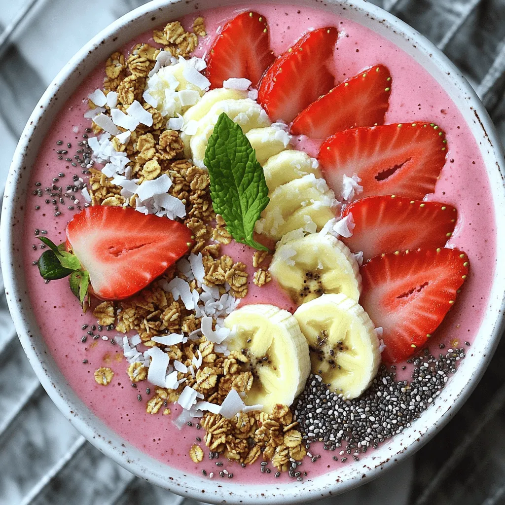 ![- 1 frozen banana, sliced - 1 cup frozen strawberries - ½ cup Greek yogurt - ½ cup almond milk (or your choice of milk) - 1 tablespoon honey or maple syrup - 1 teaspoon vanilla extract - Fresh strawberry slices - Banana slices - Granola - Shredded coconut - Chia seeds - Mint leaves To create a delicious strawberry banana smoothie bowl, you need simple yet flavorful ingredients. The main ingredients include frozen banana slices, frozen strawberries, and creamy Greek yogurt. These three form a rich and smooth base for your bowl. Frozen bananas add natural sweetness and a thick texture. Frozen strawberries provide a tart flavor that balances the sweetness. Greek yogurt gives it a creamy consistency and adds protein. You can customize your smoothie bowl with a few additional ingredients. Almond milk or any milk you prefer helps blend everything smoothly. Sweeteners like honey or maple syrup can enhance the flavor. A splash of vanilla extract adds warmth and depth. Toppings make your smoothie bowl fun and colorful. Fresh strawberry and banana slices bring brightness. Granola adds crunch, while shredded coconut, chia seeds, and mint leaves offer extra flavor and texture. For the full recipe, check the section above. Enjoy crafting this healthy and refreshing treat! To start, gather your ingredients. You will need a frozen banana, frozen strawberries, Greek yogurt, almond milk, honey, and vanilla. 1. In a blender, combine: - 1 frozen banana, sliced - 1 cup frozen strawberries - ½ cup Greek yogurt - ½ cup almond milk - 1 tablespoon honey or maple syrup - 1 teaspoon vanilla extract 2. If the mixture feels too thick, add a splash more milk. This helps blend everything smoothly. For a creamy texture, blend on high. Here are some tips: - Stop the blender halfway through. Scrape down the sides with a spatula. This ensures even blending. - Blend until the mixture is smooth and thick but not too runny. Once blended, it’s time to serve! 1. Pour the smoothie mixture into a bowl. Use a spatula to smooth the top. 2. Now for the fun part! Decorate your bowl with toppings. You might try: - Sliced fresh strawberries - Banana slices - Granola - Shredded coconut - Chia seeds - Mint leaves Enjoy your strawberry banana smoothie bowl! For the full recipe, check out the other sections! To make a great smoothie bowl, you need the right consistency. A thick, creamy base makes it enjoyable to eat. Start with one frozen banana and one cup of frozen strawberries. These fruits add natural sweetness and a nice texture. Blend them with Greek yogurt and almond milk. If it’s too thick, add a splash more milk. This helps you get a smooth mix. Choosing high-quality ingredients is key. Fresh, ripe fruits boost flavor. Organic yogurt gives a creamy taste without extra additives. Look for almond milk with no added sugar. These choices make your bowl both tasty and healthy. Arranging toppings can be fun and creative. Start by pouring your smoothie base into a bowl. Use a spatula to smooth the surface. Next, add toppings in a way that looks appealing. Try making a rainbow effect with fresh strawberries, banana slices, and granola. You can also sprinkle shredded coconut and chia seeds for added crunch. Using colorful ingredients is important for visual appeal. Bright fruits and greens catch the eye. A few mint leaves on top add a nice pop of color. This makes your smoothie bowl a feast for the eyes, not just the taste buds. Adjusting sweetness levels is easy. If you like it sweeter, add more honey or maple syrup. Start with one tablespoon and taste as you go. You can always add more if needed. For those who prefer dairy-free options, swap Greek yogurt for coconut yogurt. This keeps the bowl creamy while being dairy-free. Almond milk or oat milk works well too. These changes let you enjoy the smoothie bowl without compromising your taste. For the full recipe, check out the Strawberry Banana Bliss Smoothie Bowl. {{image_2}} You can boost the flavor of your smoothie bowl. Adding spinach or kale gives you extra greens. These greens mix well with the sweet strawberries and bananas. They add nutrients without changing the taste much. You can also try other fruits. Mango, blueberries, or pineapple can add new flavors. Imagine a tropical twist with mango! Each fruit brings its own unique taste and color. Toppings can change your smoothie bowl game. Try adding nut butters for a creamier texture. Almond or peanut butter can add rich flavor. They also give healthy fats that keep you full. Seeds are another great option. Chia seeds or flaxseeds add crunch and nutrition. You can also use granola or shredded coconut for extra texture. Mixing these toppings creates fun flavors and textures. Seasons bring different fruits to enjoy. In summer, use peaches or berries. Fall is perfect for apples or pears. Each season offers fruits that make your bowl special. For festive occasions, add colorful toppings. Use pomegranate seeds for a pop of red. Sprinkle cinnamon or nutmeg for a warm flavor. These small changes can make your smoothie bowl feel exciting year-round. [Full Recipe] gives you a simple base. With these variations, you can create endless combinations! You can make the smoothie base ahead of time. Blend the ingredients and store it in the fridge. Use an airtight container to keep it fresh. This way, you can enjoy quick breakfasts or snacks. I suggest using the smoothie base within 24 hours for the best taste. For ingredients, keep frozen bananas and strawberries in the freezer. They last long and keep your smoothie cold. Store Greek yogurt in the fridge. It stays good for about one to three weeks, depending on the brand. You can freeze leftover smoothie bowls too. Just pour the bowl into a freezer-safe container. Leave some space at the top, as liquids expand when frozen. They can last up to three months in the freezer. When you want to eat a frozen bowl, let it thaw overnight in the fridge. If you’re in a hurry, use the microwave. 
