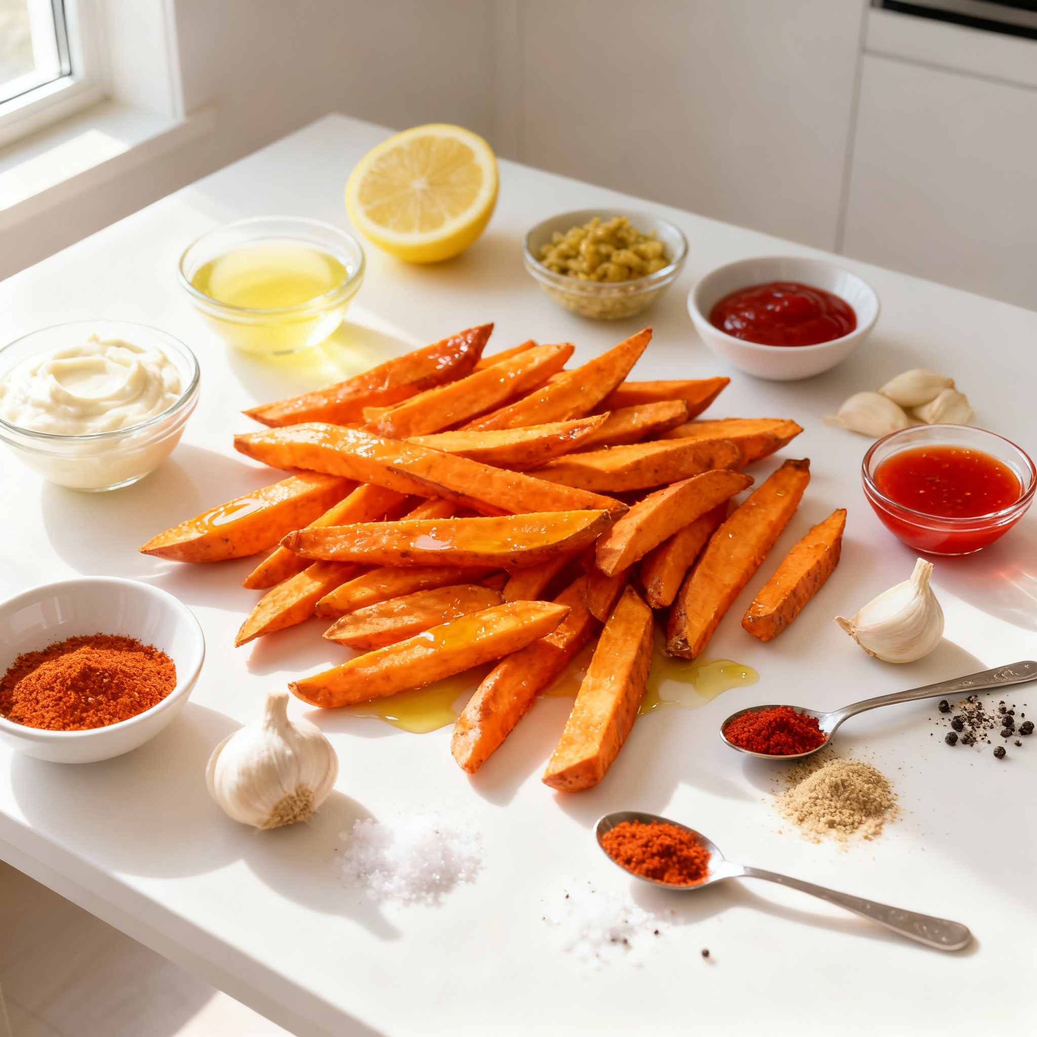Start by peeling and cutting your sweet potatoes into fries. In a large bowl, toss the fries with olive oil, paprika, garlic powder, cayenne pepper, salt, and pepper. Use your hands to mix well, ensuring every fry gets coated. If you want more heat, add more cayenne or sriracha later.